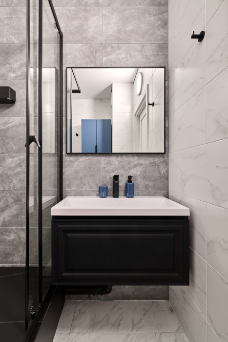 Современный санузел оснащён душевой зоной, стиральной машиной, раковиной с зеркалом и базовыми удобствами. В квартире аккуратно, светло и тихо — окна выходят во двор.