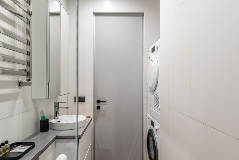 Квартира площадью 53 м² включает две отдельные спальни, просторную гостиную, полностью оборудованную кухню и два санузла, каждый с душевой кабиной и туалетом. В апартаментах есть Wi-Fi, бытовая техника и все базовые удобства для комфортного проживания. Окна выходят в закрытый тихий двор.