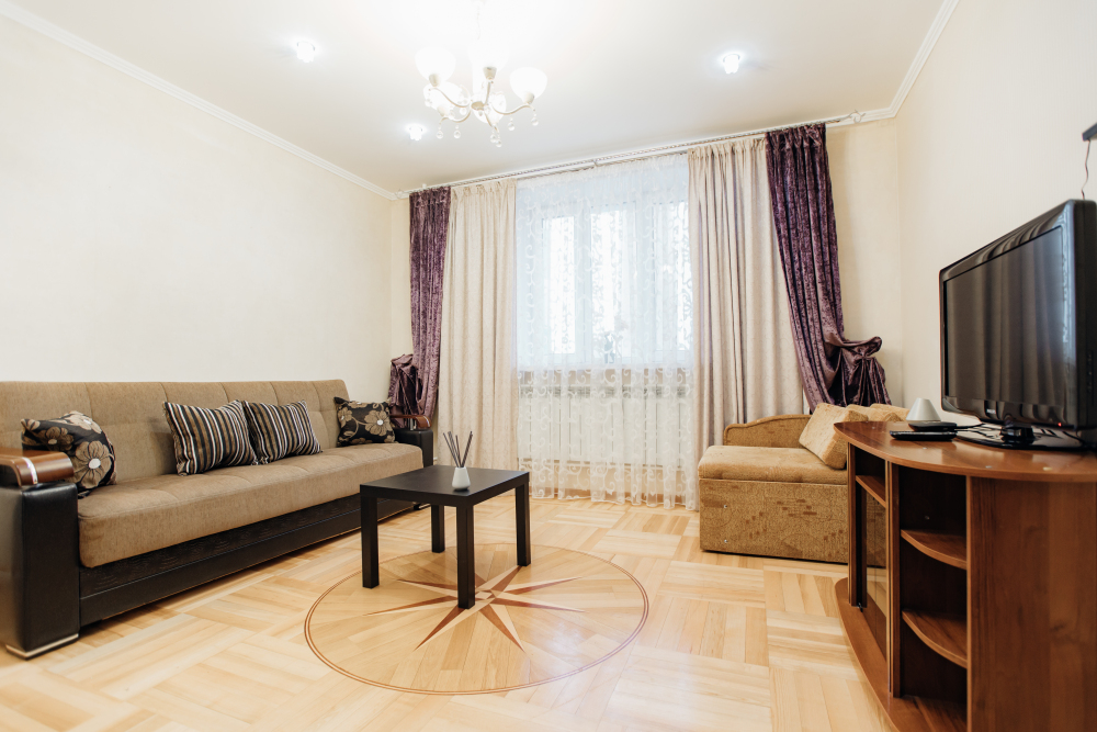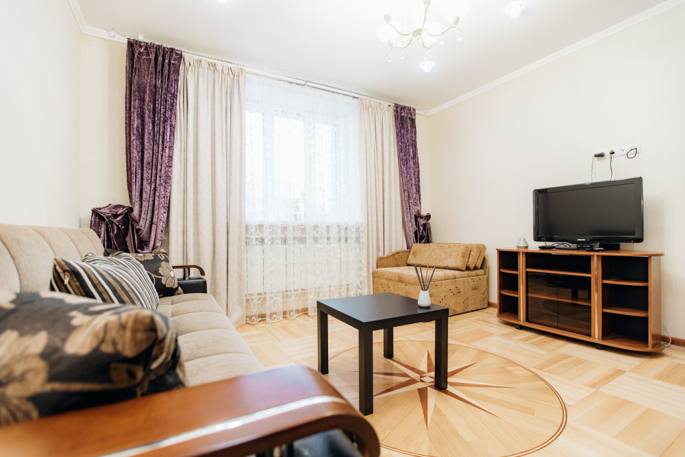 В квартире 2 двуспальные кровати, двуспальный диван, две полноценные тахты (спальное место 80*200). 8 спальных мест. 3 полноценные изолированные комнаты. Современная мебель, новая сантехника, натяжные потолки, стеклопакеты, хорошая шумоизоляция, фен, утюг, гладильная доска, сушилка для белья, стиральная машина. Есть все необходимое для проживания. Кухня оснащена всеми необходимыми бытовыми приборами (холодильник, микроволновка, электрический чайник, духовка) и столовыми принадлежностями (кастрюли, сковорода, кружки, тарелки, столовые приборы). Цифровое телевидение, высокоскоростной безлимитный интернет (wi-fi). Ванная и туалет – кафель. Предоставляем комплекты постельного белья, махровые полотенца, одноразовые тапочки, набор гостиничной парфюмерии: шампунь, гель и мыло.