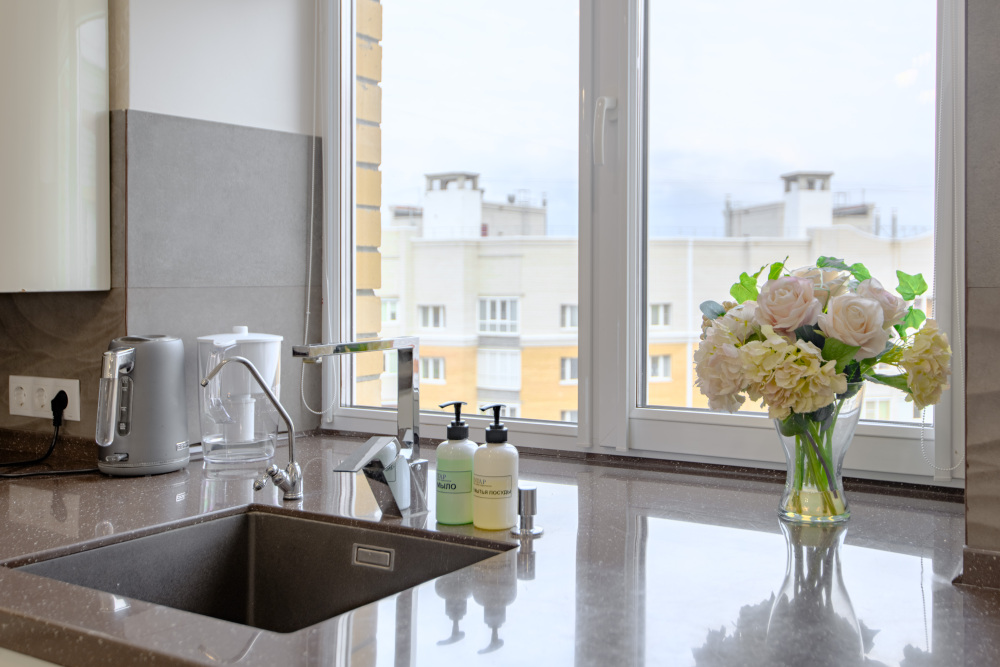 - Полностью оборудованная кухня (холодильник, газовая варочная панель, духовой шкаф, вытяжка, микроволновая печь, электрический чайник, фильтр для питьевой воды).