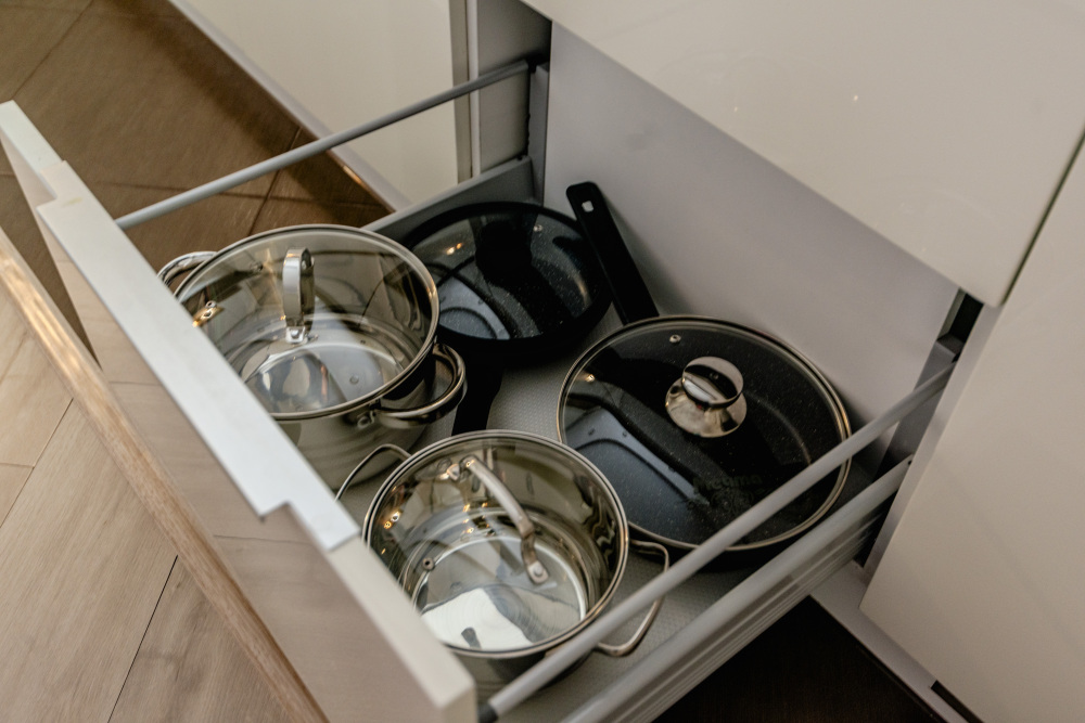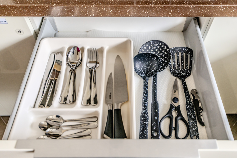 - Посуда, столовые приборы, кастрюли и сковороды.