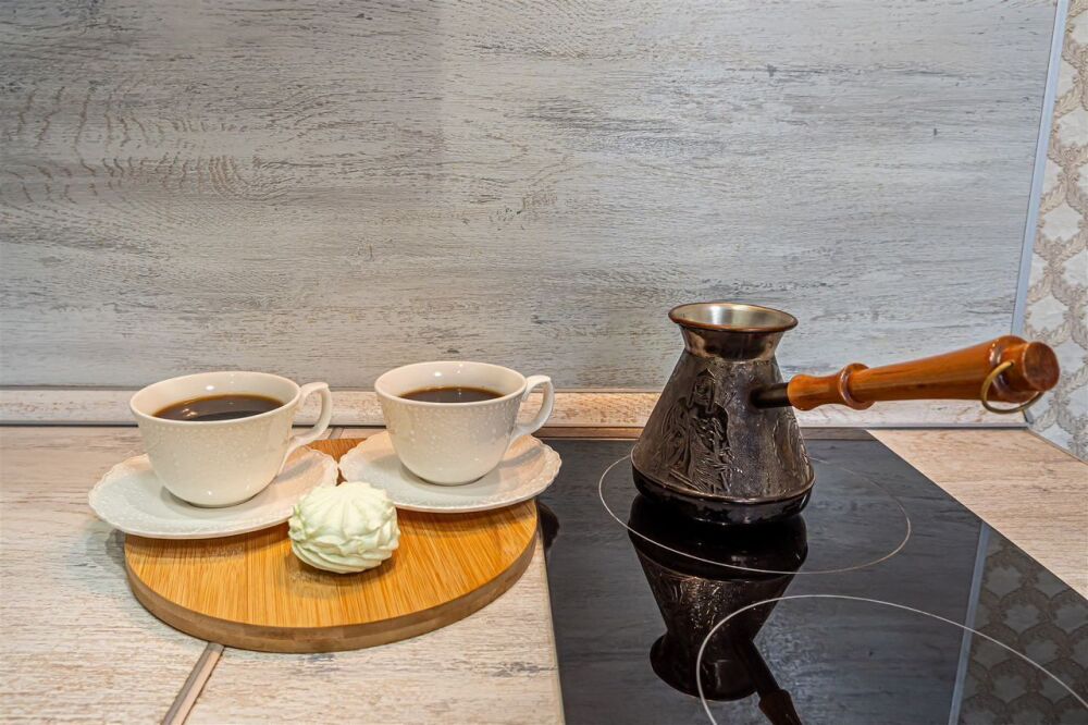 - посуда, кастрюли, сотейник, турка для кофе, столовые приборы, чашки, бокалы для вина и воды;