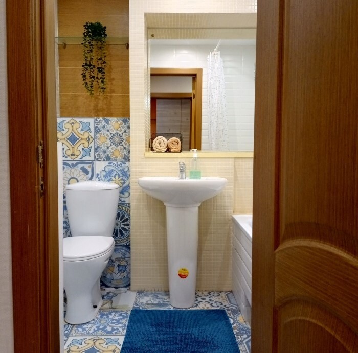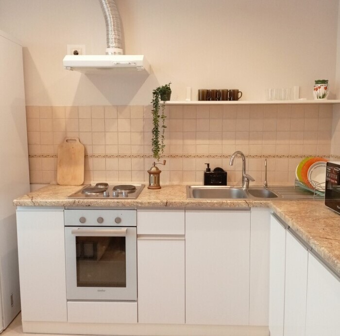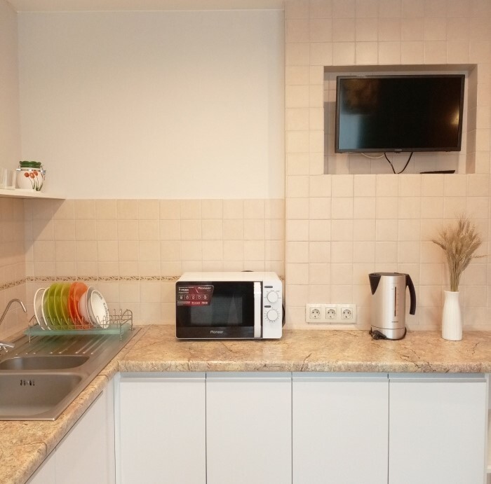 - вместимость до 5 человек (2+2+1): двуспальная диван-кровать, односпальная кровать и диван для двоих на кухне;