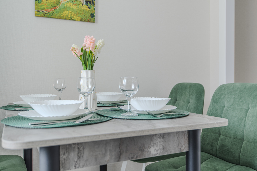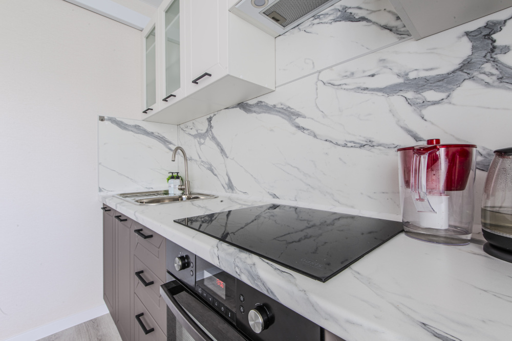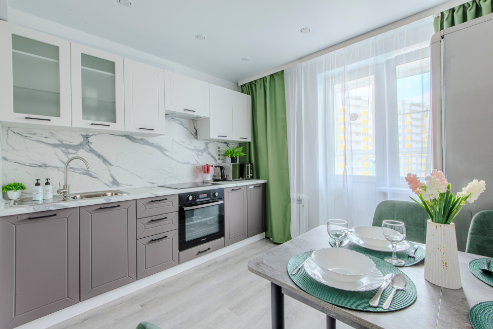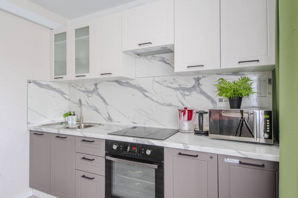 - Полностью оборудованная кухня (холодильник, электрическая варочная панель, духовка, вытяжка, микроволновая печь, электрический чайник, фильтр для питьевой воды).