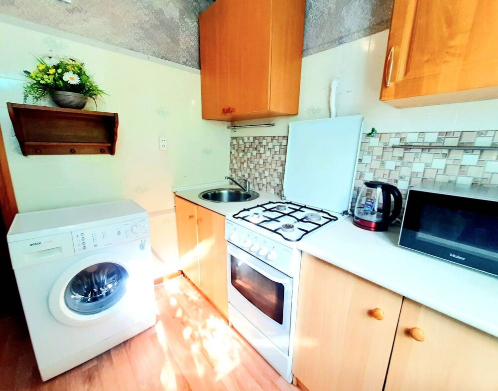 Вся необходимая посуда, электрический чайник, микроволновая печь, электроплита, холодильник, сушилка для белья, стиральная машина, утюг, гладильная доска, фен, Wi-fi, телевидение (120 каналов).