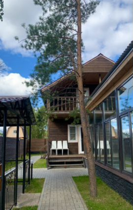 Двухэтажный дом расположен в Подмосковье в 25 кМ от МКАД. Деревянный коттедж в скандинавском стиле оборудован всеми удобствами и коммуникациями: электричество, отопление, горячее и холодное водоснабжение, система водоотведения. На первом этаже расположена гостевая, смежная с кухней. На втором этаже две спальные комнаты с выходом на балконы. Санузел - на обоих этажах.