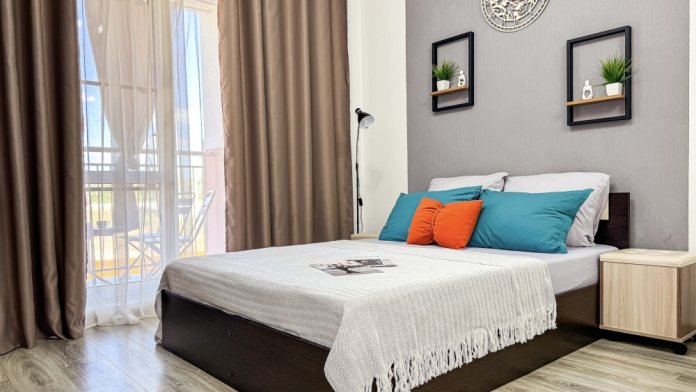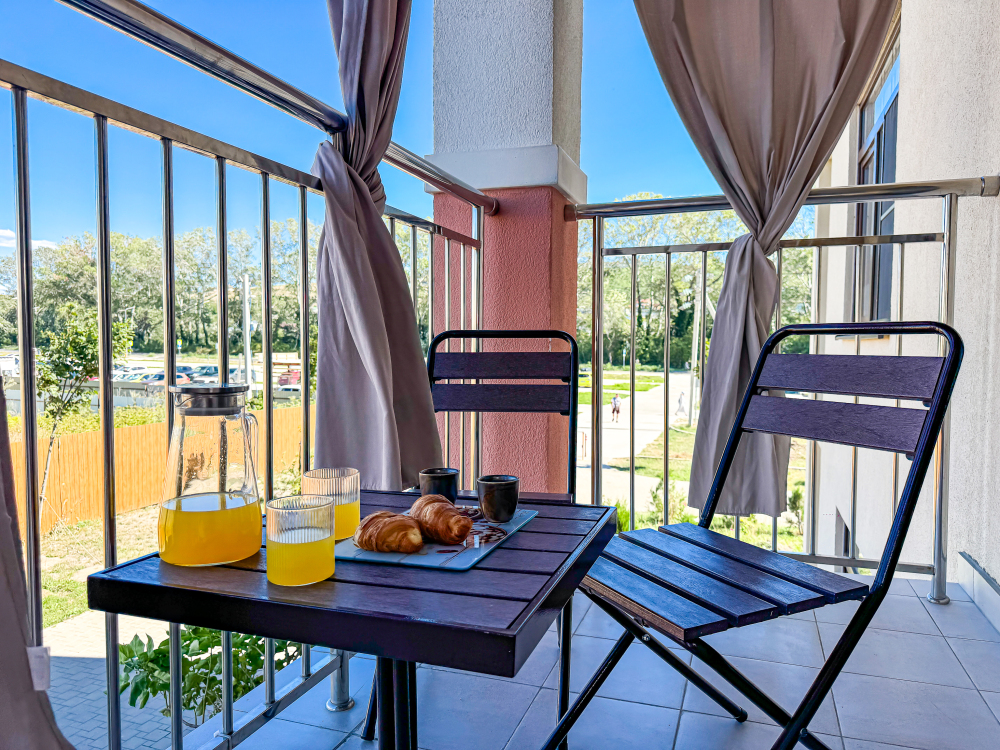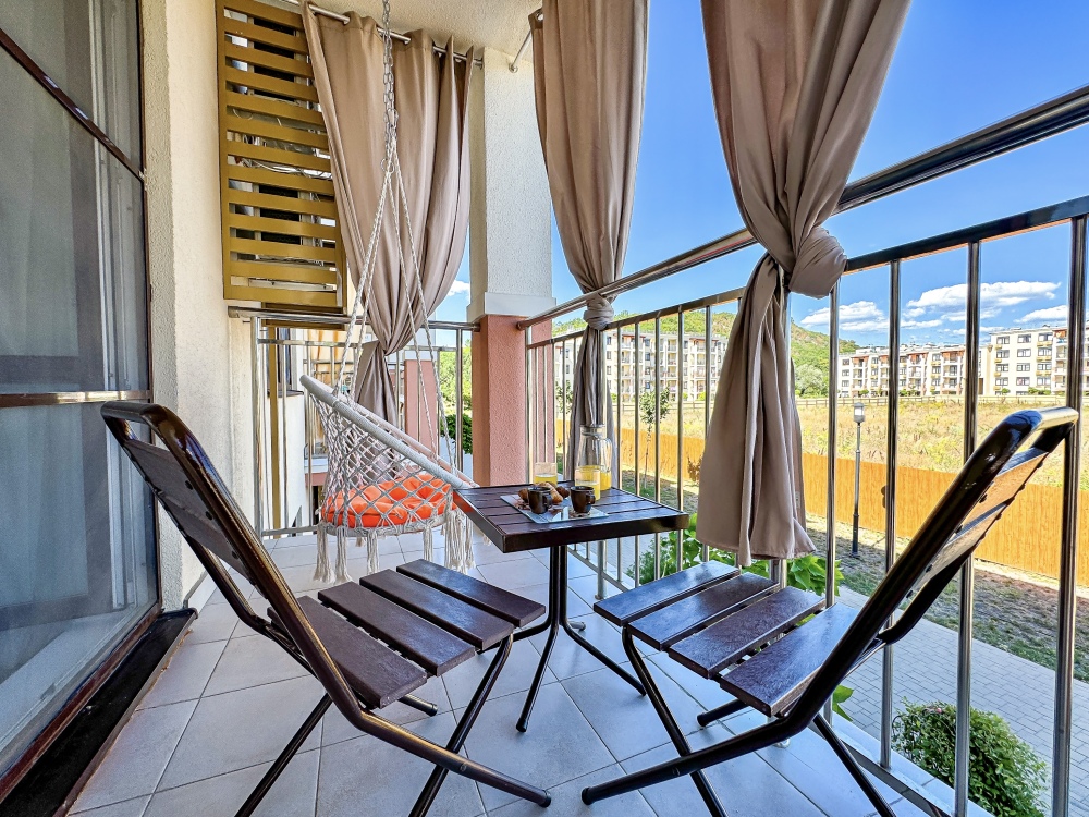 - Шторы Black Out, утюг, балкон с мебелью и качелями.
