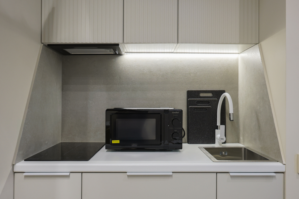 - плита, вытяжка, микроволновая печь, холодильник, чайник;