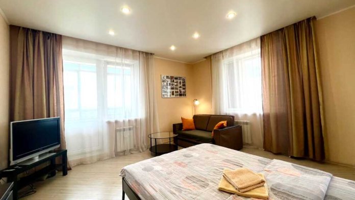 ️Современная мебель, новая сантехника, натяжные потолки, хорошая шумоизоляция, утюг, гладильная доска, сушилка для белья. Есть все необходимое для проживания. В комнате находится двуспальная кровать с ортопедическим матрасом, шкаф, двуспальный диван, ЖК-телевизор. Кухня оборудована всей необходимой бытовой техникой (холодильник, микроволновая печь, электрический чайник) и посудой для приготовления пищи. Ванная, туалет – кафель, стиральная машина автомат. Цифровое TВ , высокоскоростной безлимитный интернет(wi-fi). Предоставляем комплекты постельного белья, махровые полотенца, одноразовые тапочки, набор гостиничной парфюмерии: шампунь, гель и мыло. Идеальная чистота и порядок, уборка после каждого гостя. Балкон застеклён (разрешено курение строго на балконе!). Во дворе удобная парковка для авто.