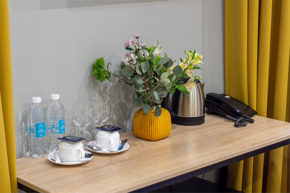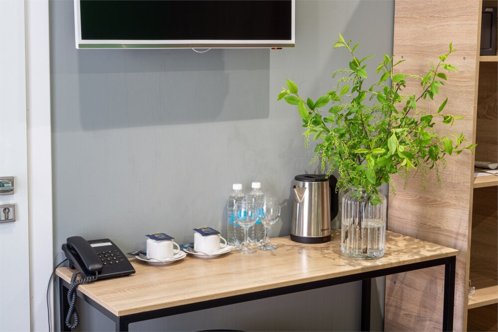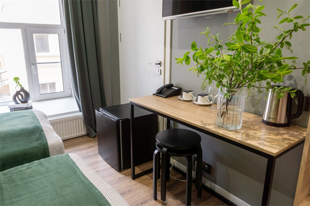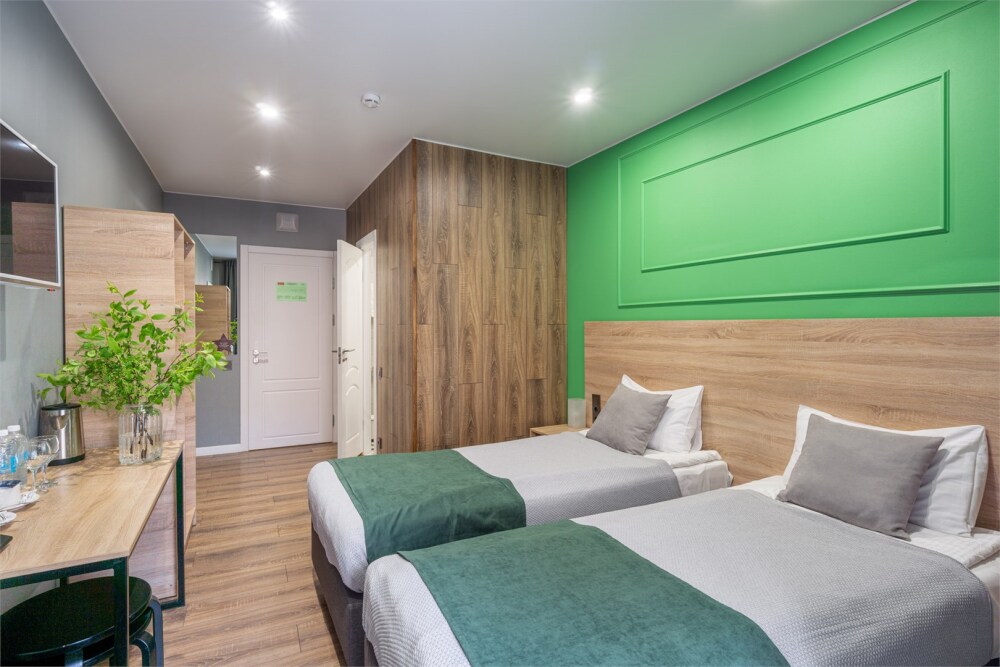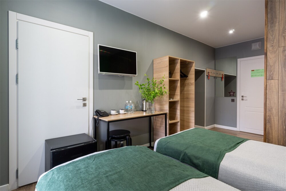 В номере: две односпальные кровати, прикроватные тумбочки, стол, стулья, ЖК-телевизор, шкаф, сейф, телефон, электрический чайник, мини-бар, душ, туалет, фен, отопление, звукоизоляция, туалетно-косметические принадлежности, постельное белье, полотенца, тапочки, вешалки для одежды, подключение к кабельному и цифровому телевидению, доступ к беспроводной сети WI-FI.