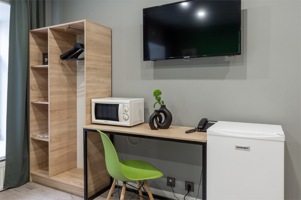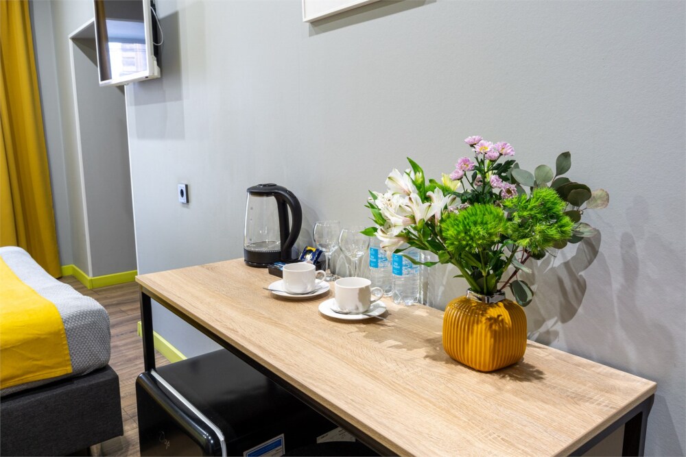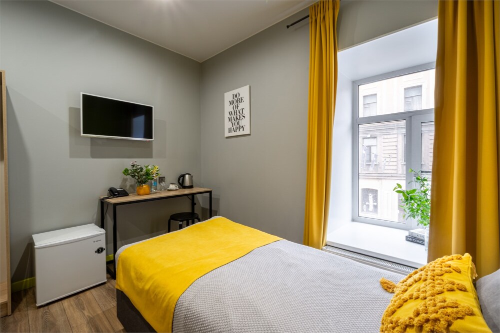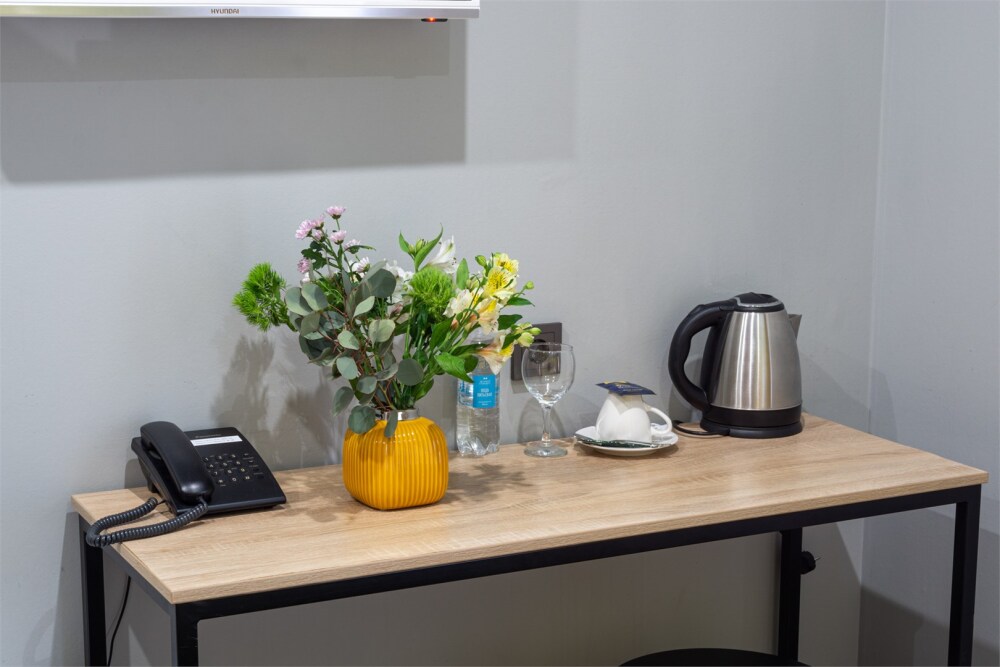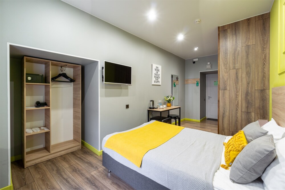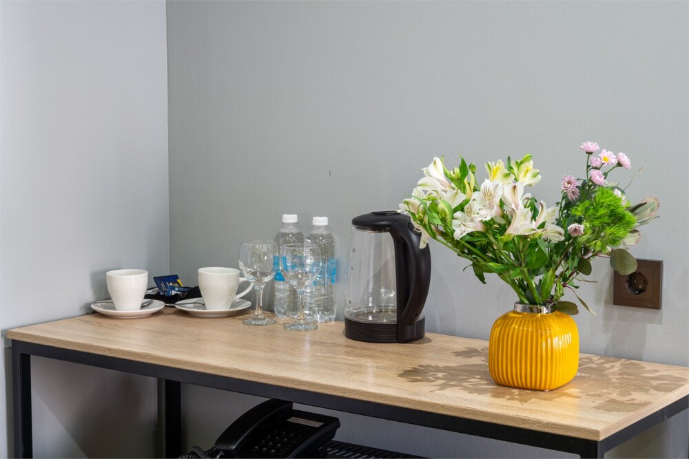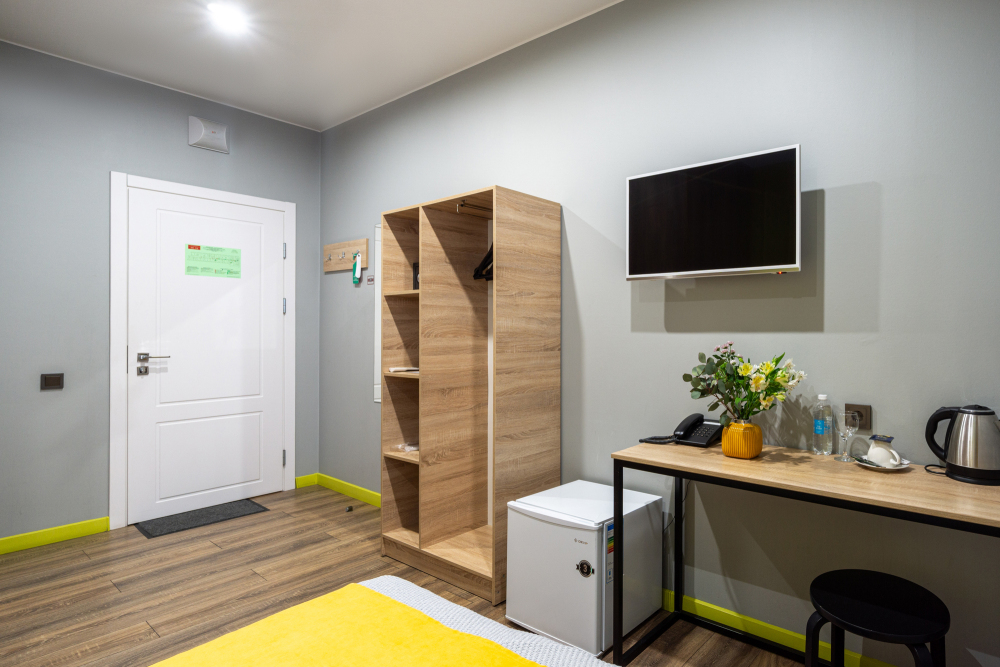 В номере: односпальная кровать, прикроватные тумбочки, стол, стулья, шкаф, ЖК-телевизор, сейф, телефон, электрический чайник, мини-бар, душ, туалет, фен, отопление, звукоизоляция, туалетно-косметические принадлежности, постельное белье, полотенца, тапочки, вешалки для одежды, подключение к кабельному и цифровому телевидению, доступ к беспроводной сети WI-FI.