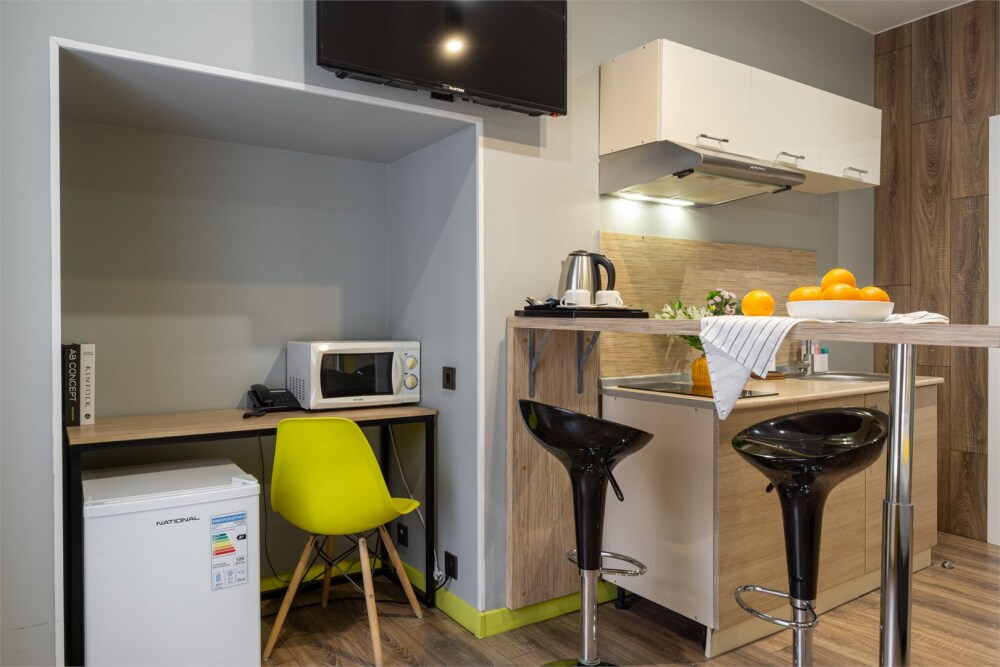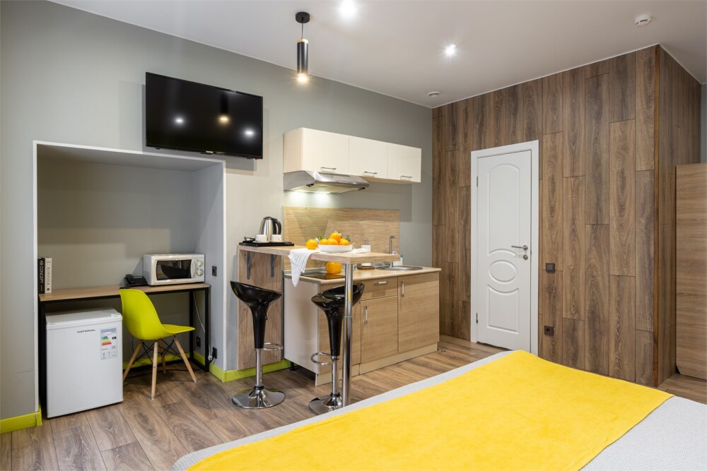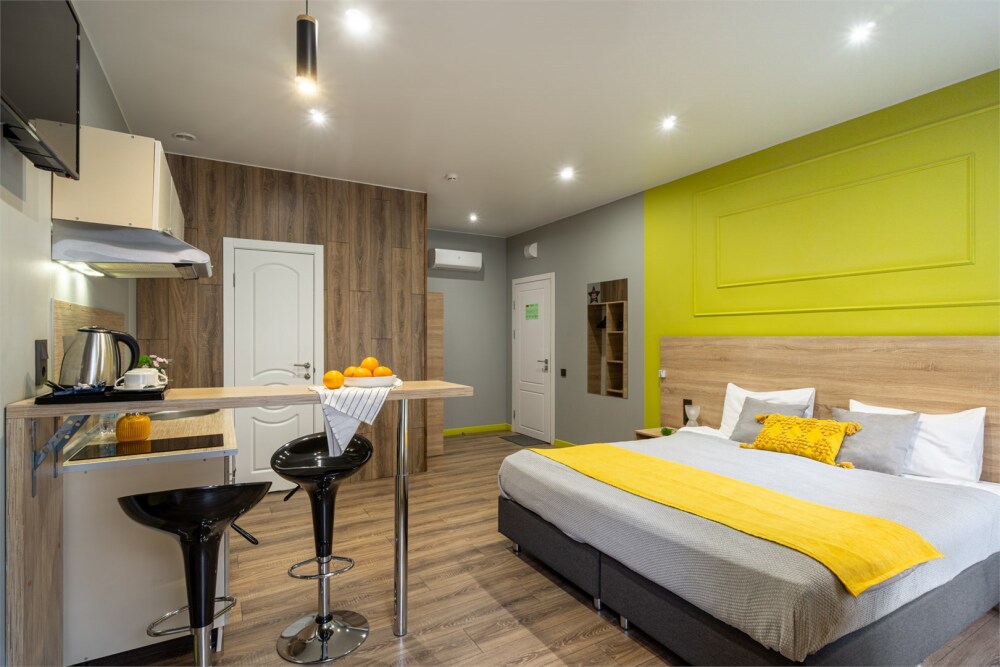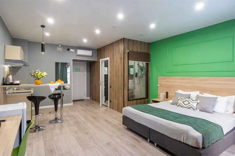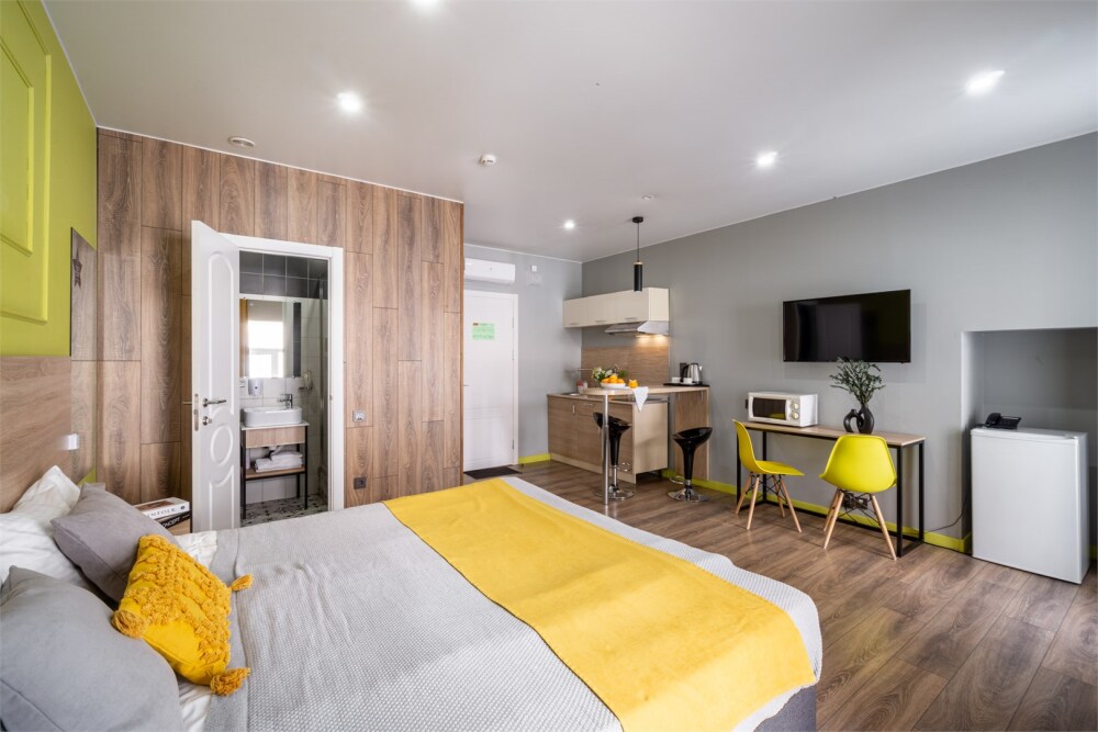 В номере: двуспальная кровать, прикроватные тумбочки, стол, стулья, шкаф ЖК-телевизор, кондиционер, телефон, сейф, мини-кухня, электрический чайник, микроволновая печь, электрическая варочная панель, мини-бар, душ, туалет, фен, отопление, звукоизоляция, кухонные принадлежности, туалетно-косметические принадлежности, постельное белье, полотенца, тапочки, вешалки для одежды, подключение к кабельному и цифровому телевидению, доступ к беспроводной сети WI-FI.