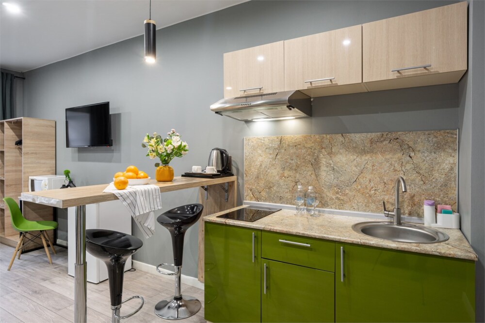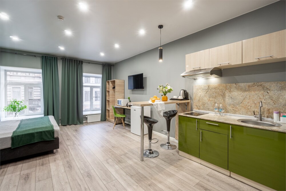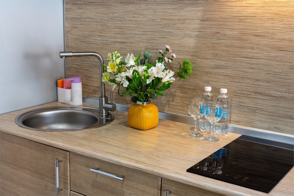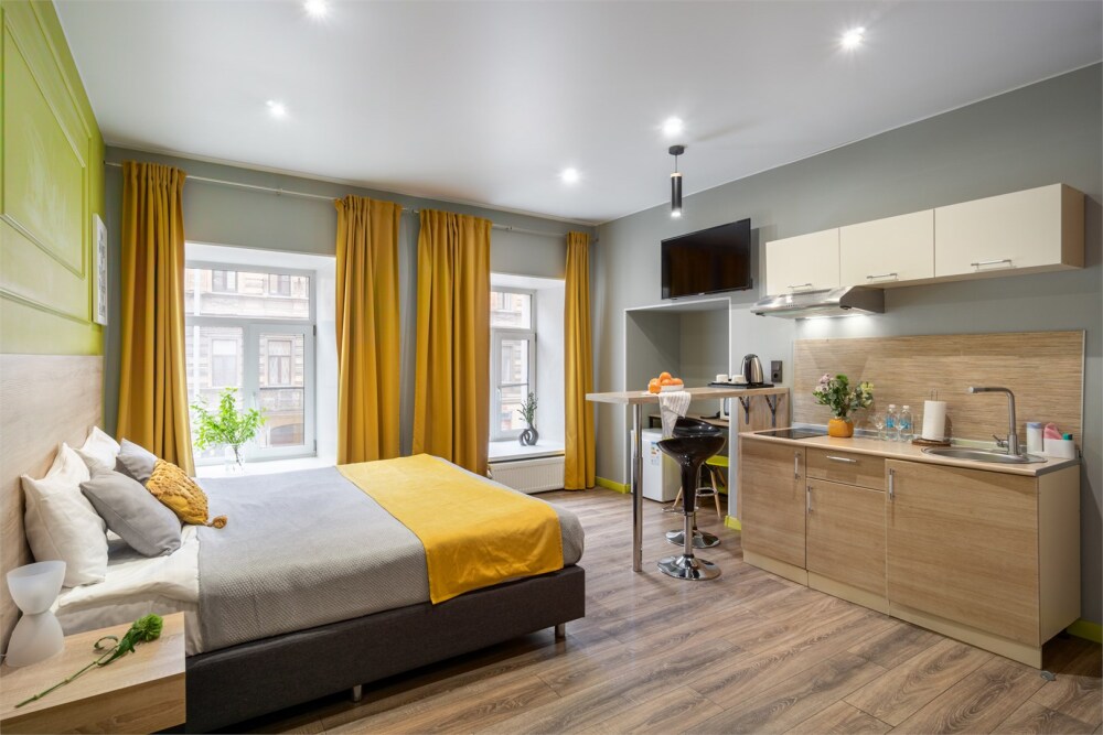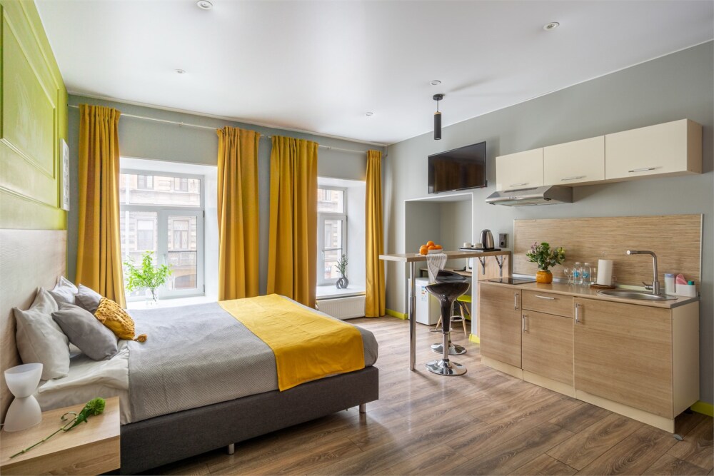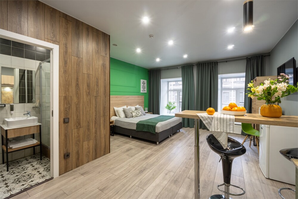 В номере: двуспальная кровать, прикроватные тумбочки, стол, стулья, шкаф ЖК-телевизор, кондиционер, телефон, сейф, мини-кухня, электрический чайник, микроволновая печь, электрическая варочная панель, мини-бар, душ, туалет, фен, отопление, звукоизоляция, кухонные принадлежности, туалетно-косметические принадлежности, постельное белье, полотенца, тапочки, вешалки для одежды, подключение к кабельному и цифровому телевидению, доступ к беспроводной сети WI-FI.