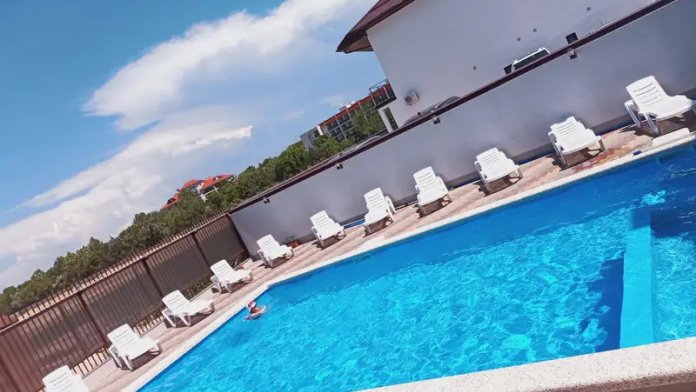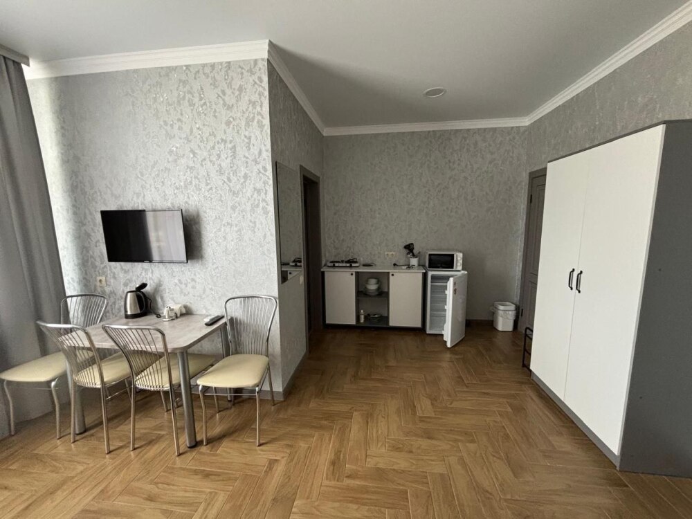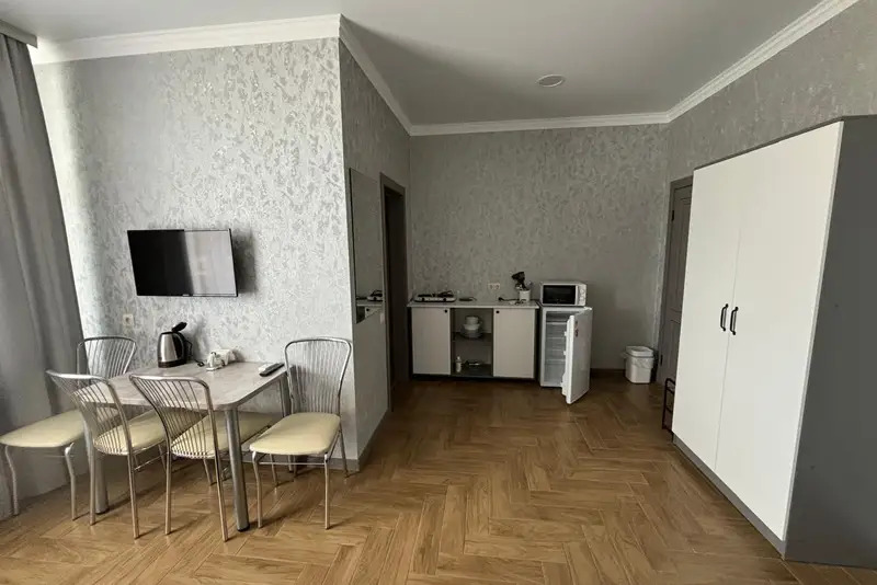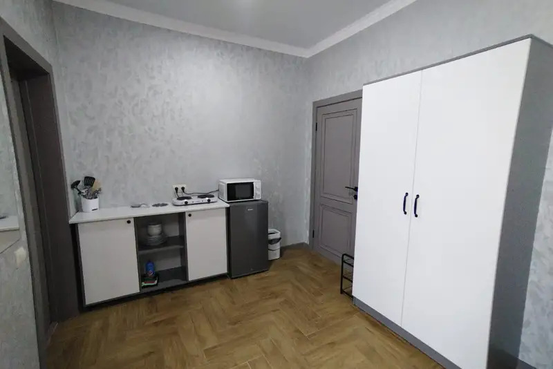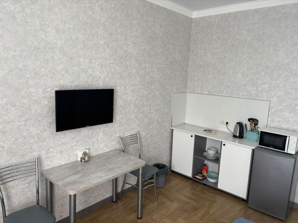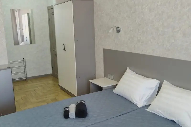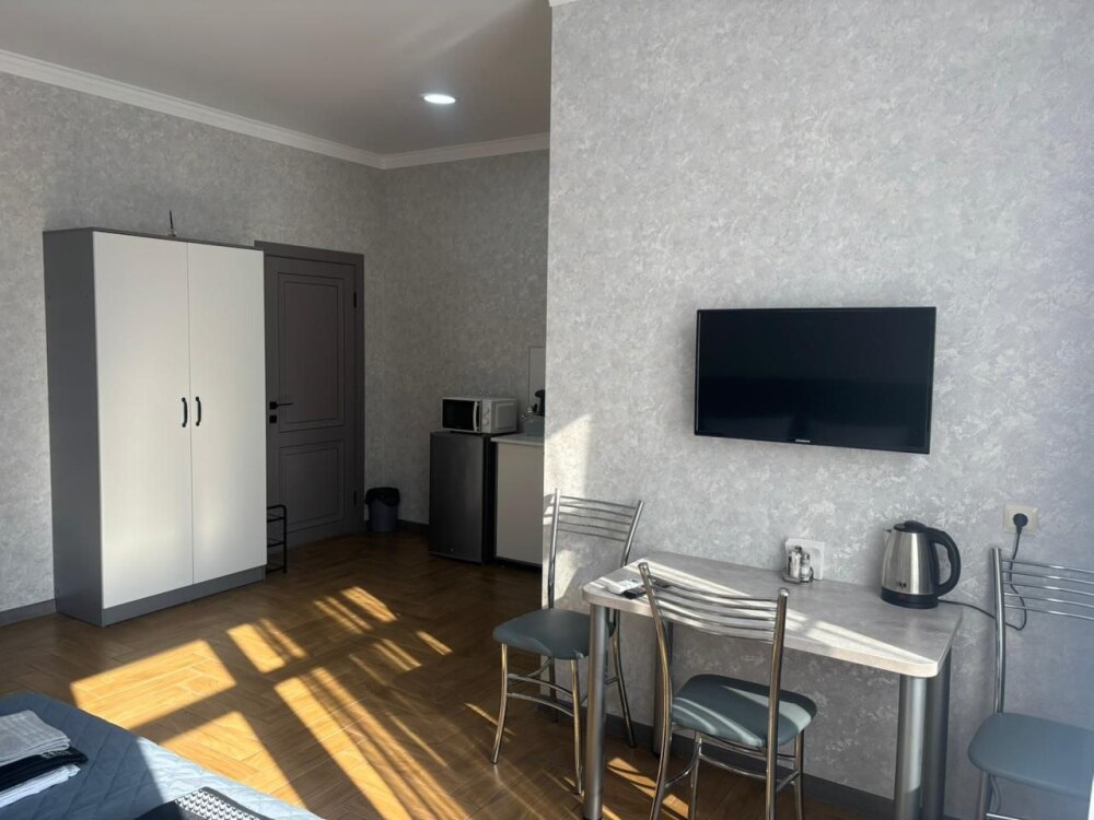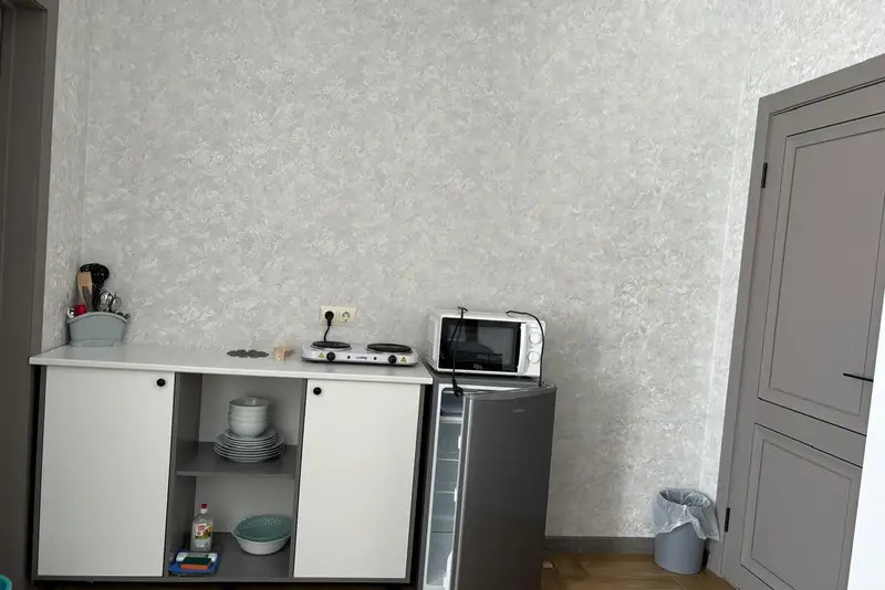 Номера-студии с мини-кухней, санузлом. На территории имеются: подогреваемый бассейн, детская площадка, спортивный уголок, место с мангалом.
