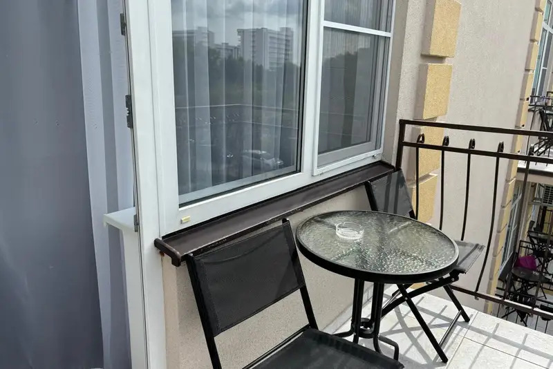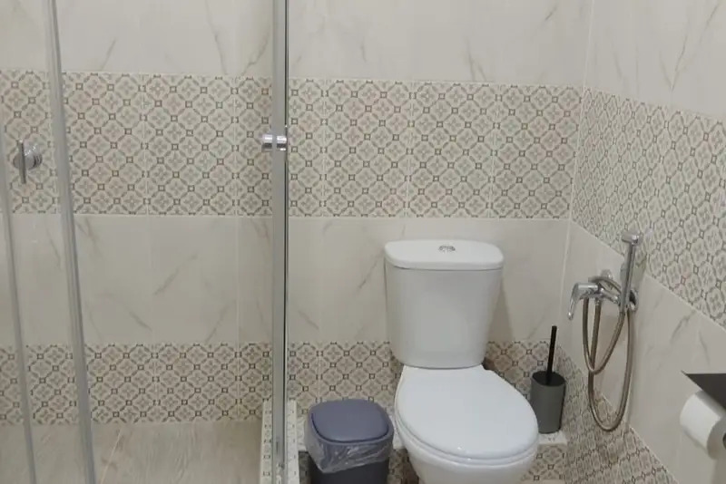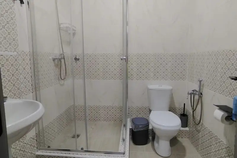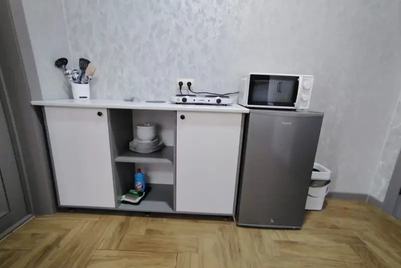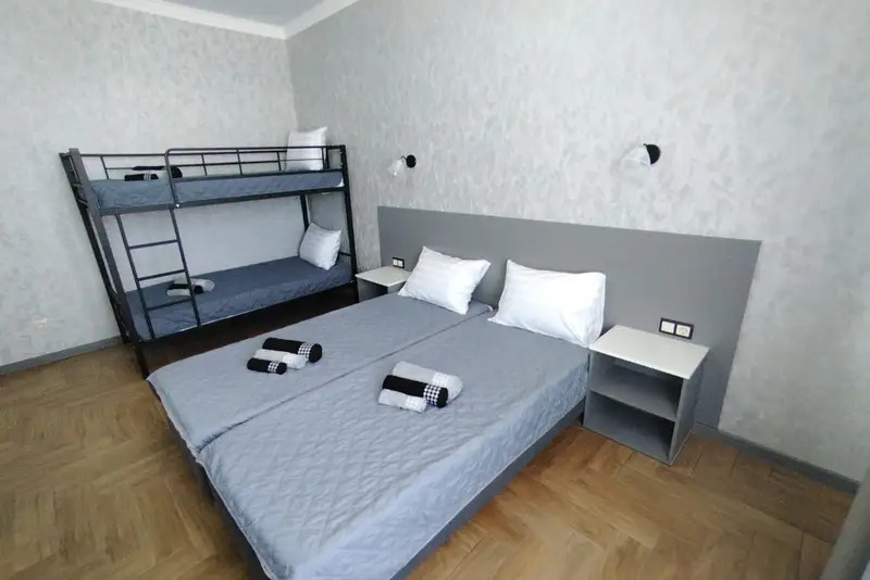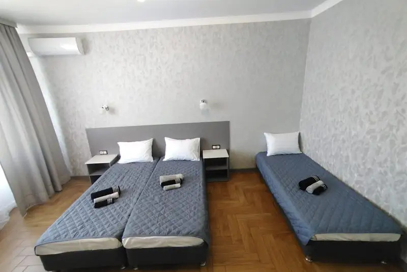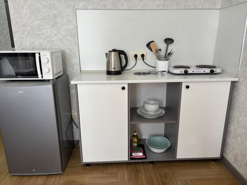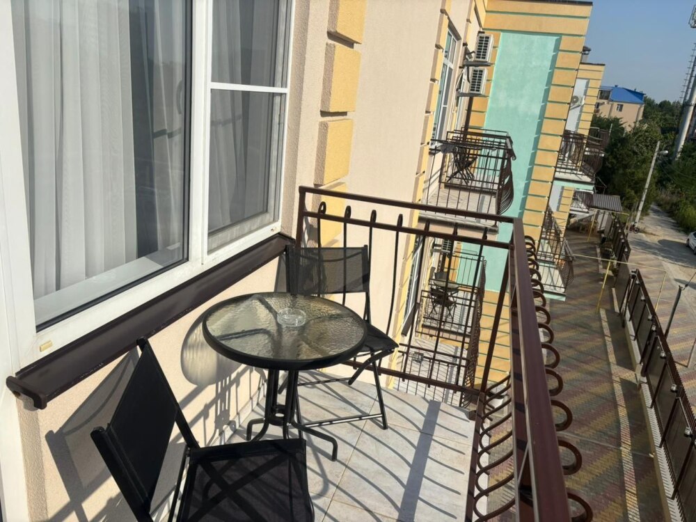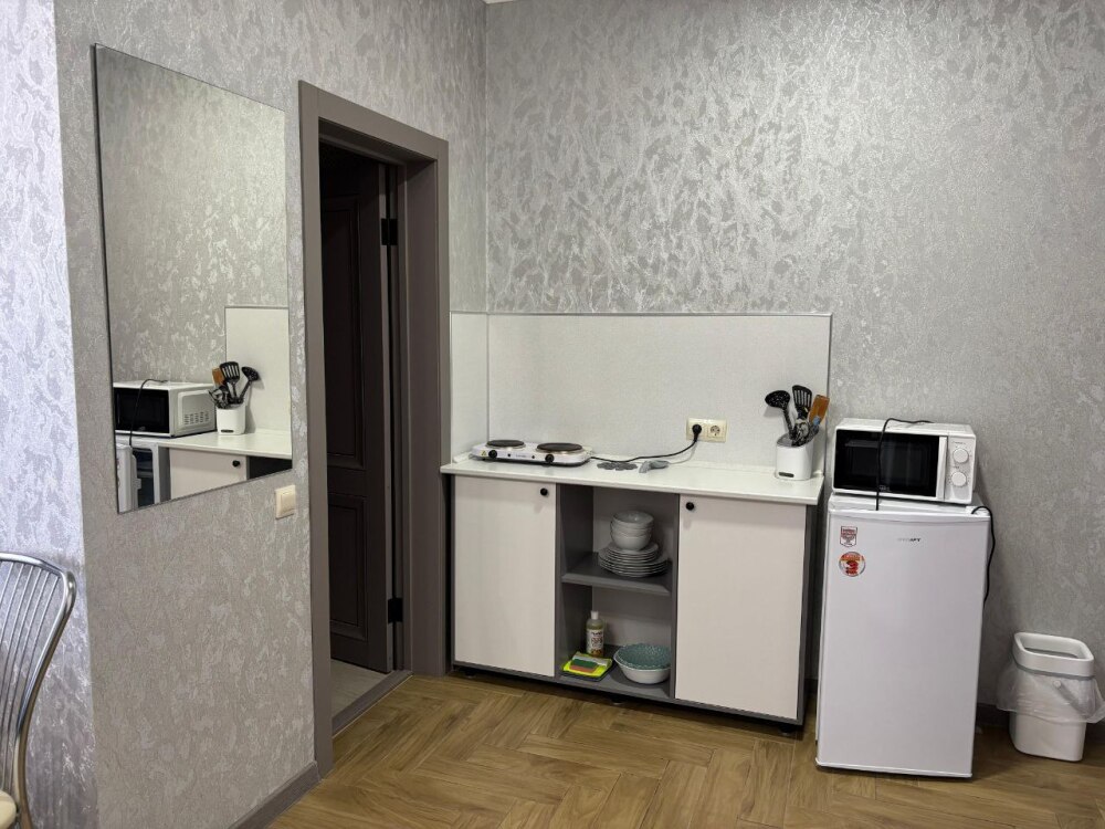 Номера-студии с мини-кухней, санузлом. На территории имеются: подогреваемый бассейн, детская площадка, спортивный уголок, место с мангалом.