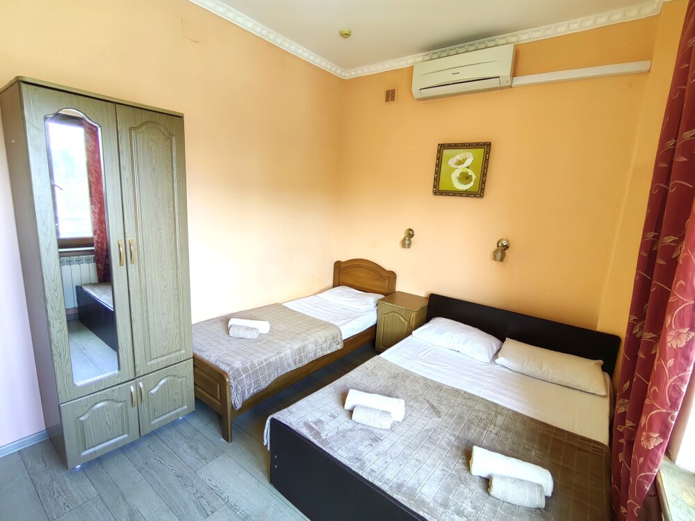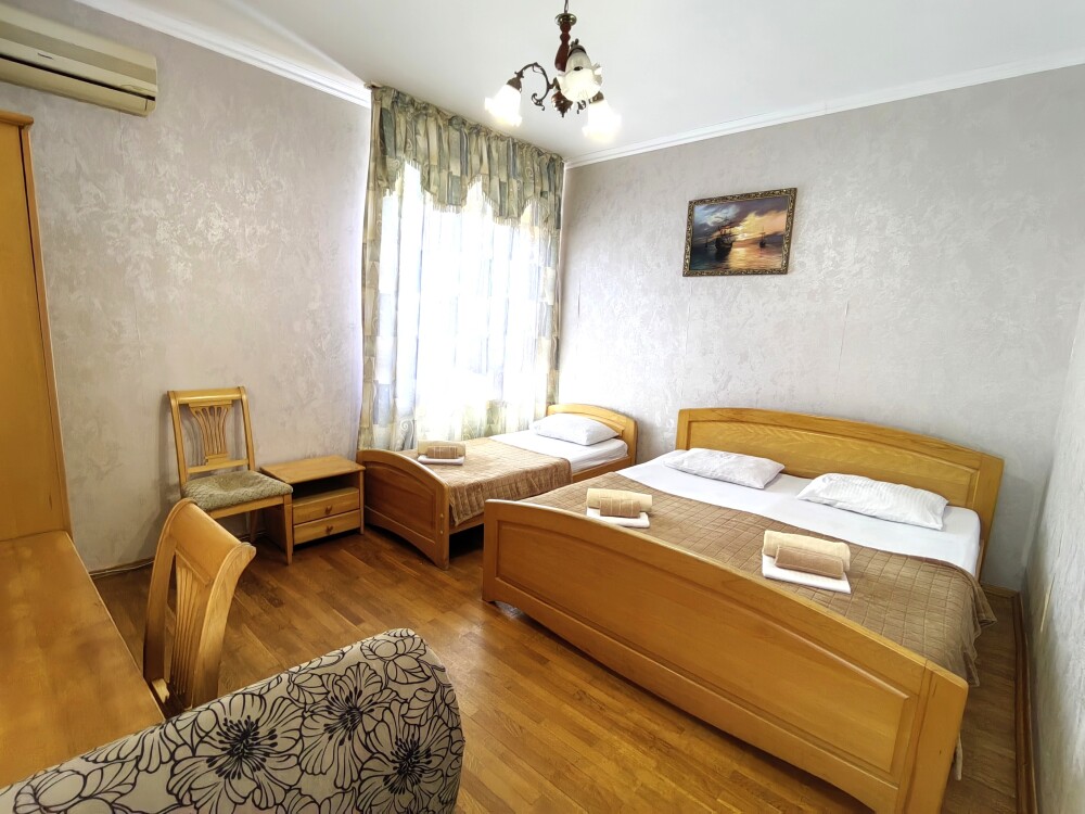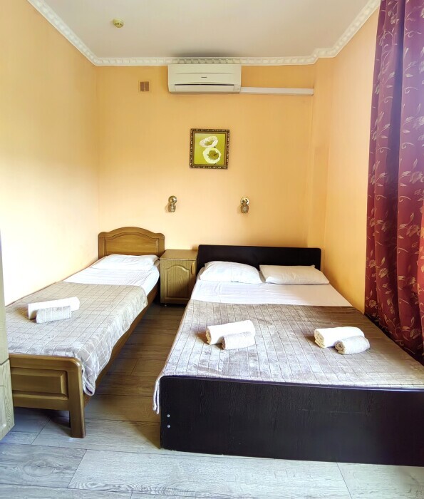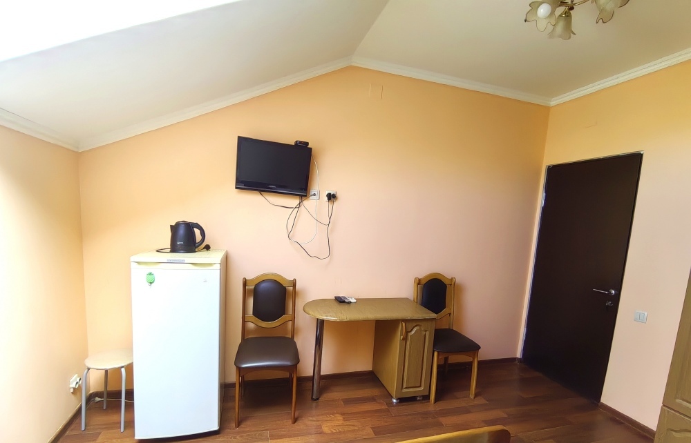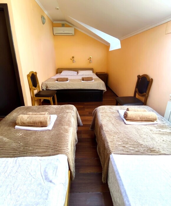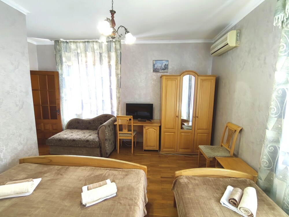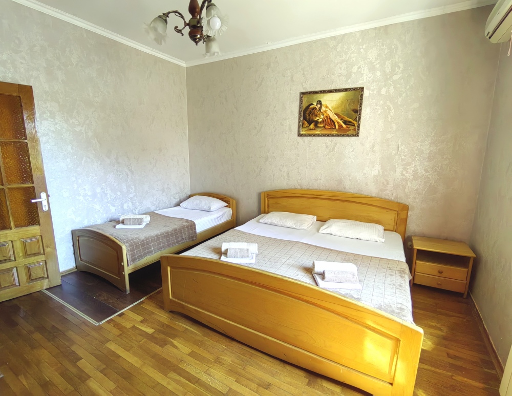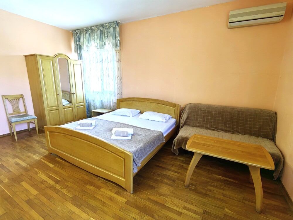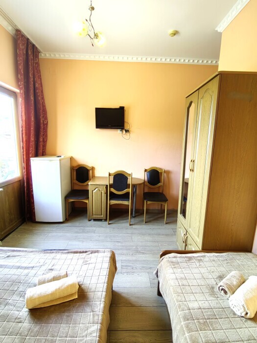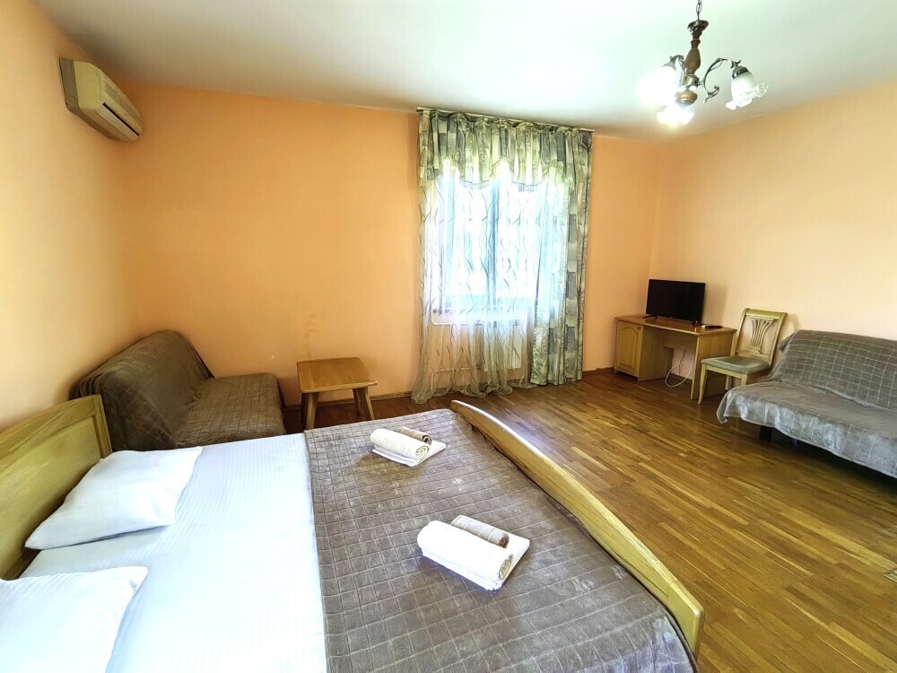 Номер для 4-5 гостей. Для комфортного проживания в номере телевизор, wi-fi, холодильник, кондиционер, стол, стулья, шкаф и санузел. Постельное бельё, пледы и полотенца предоставляем.