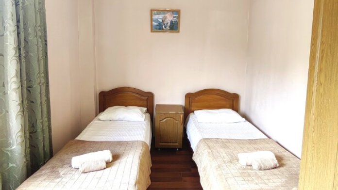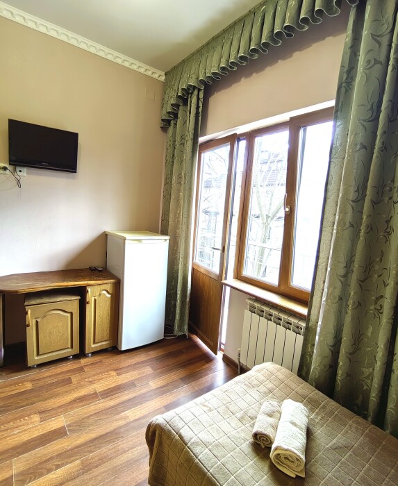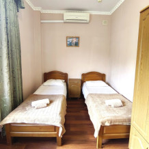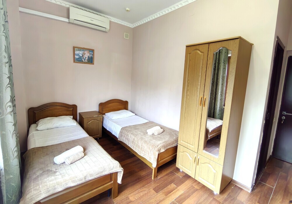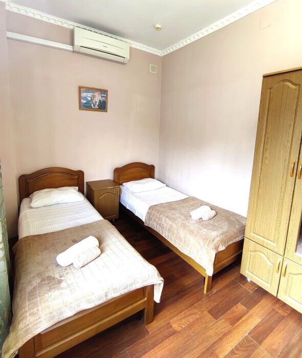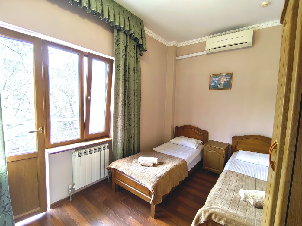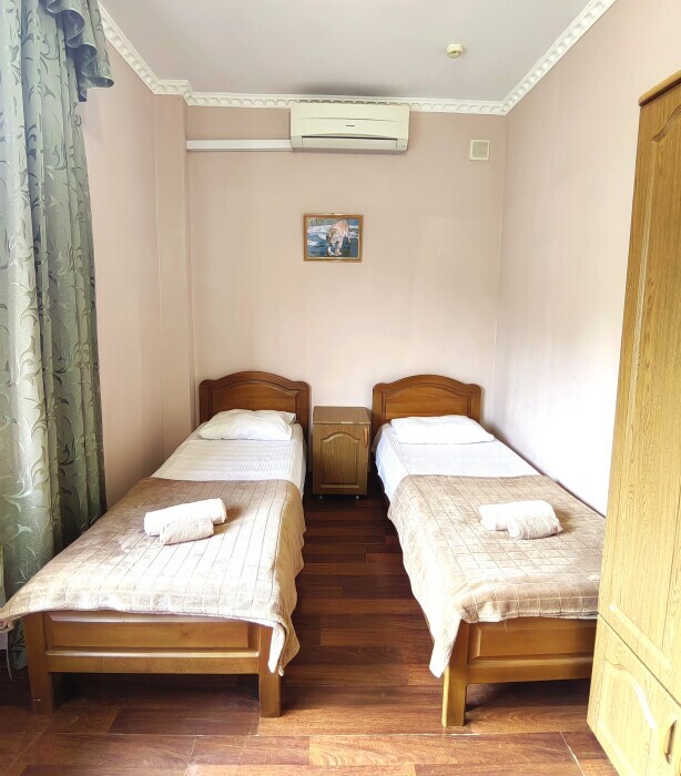 Номер с балконом для 1-2 гостей, с двумя односпальными кроватями (кровати можно сдвинуть). Для комфортного проживания в номере телевизор, wi-fi, холодильник, кондиционер, стол, стулья, шкаф и санузел. Постельное белье, пледы и полотенца предоставляем.