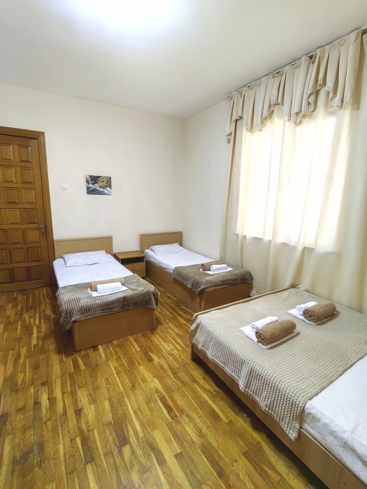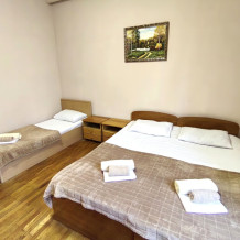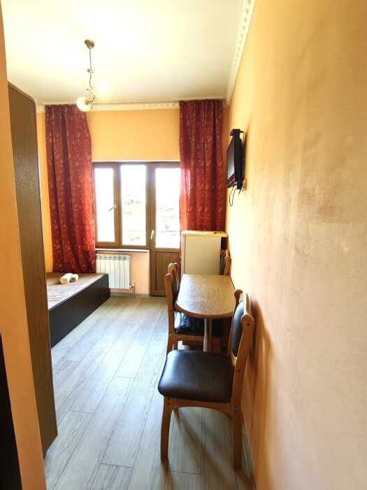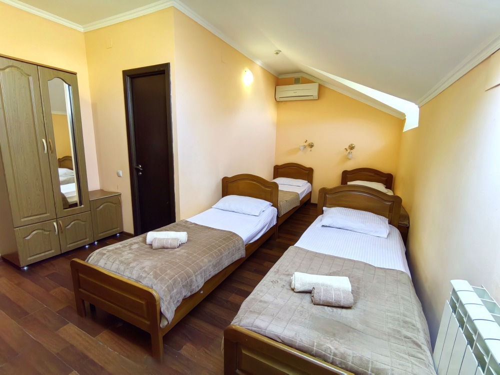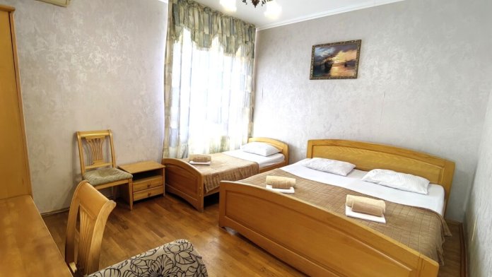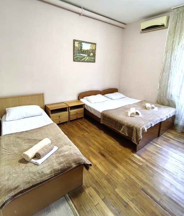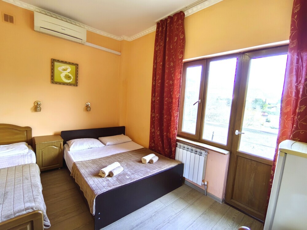 Номер с балконом для 3 гостей. Для комфортного проживания в номере телевизор, wi-fi, холодильник, кондиционер, стол, стулья, шкаф и санузел. Постельное бельё, пледы и полотенца предоставляем.