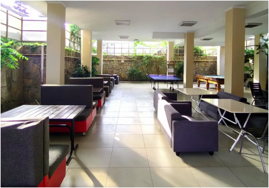 Территория не большая, но компактная. Два корпуса в четыре этажа, комфортабельные номера со всеми удобствами. Имеются двухкомнатные номера и номера с индивидуальной кухней.