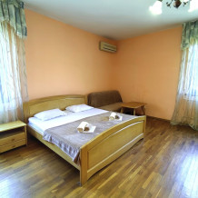 Комфортный 2-комнатный номер с мини кухней и размещением до 7 гостей. В номере две комнаты, мини кухня и санузел с ванной. Мини кухня оборудована всем необходимым для приготовления пищи, холодильник и чайник. В каждой комнате телевизор, кондиционер, стол, стулья и шкаф. Постельное белье, пледы и полотенца предоставляем.
