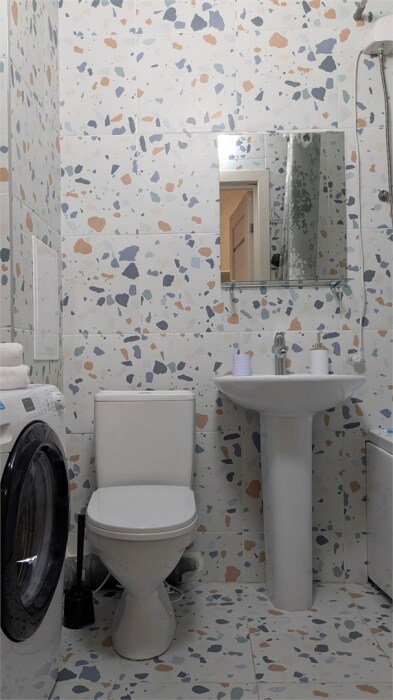 Ванная комната - отдельная история уюта: стиральная машина, фен и все необходимые принадлежности для вашего удобства.