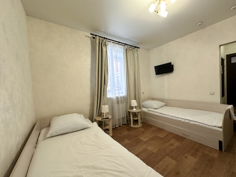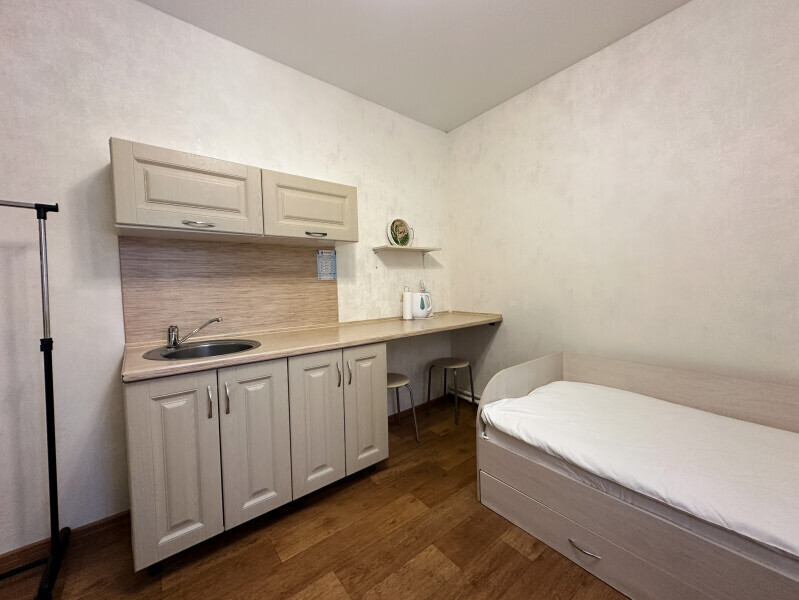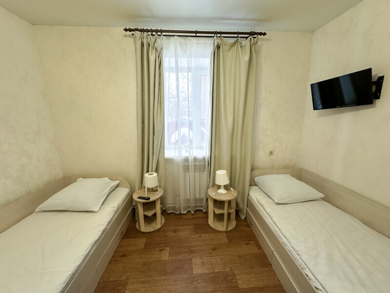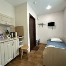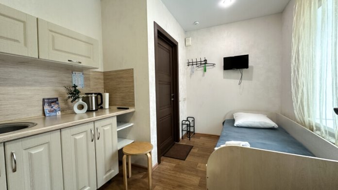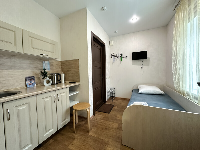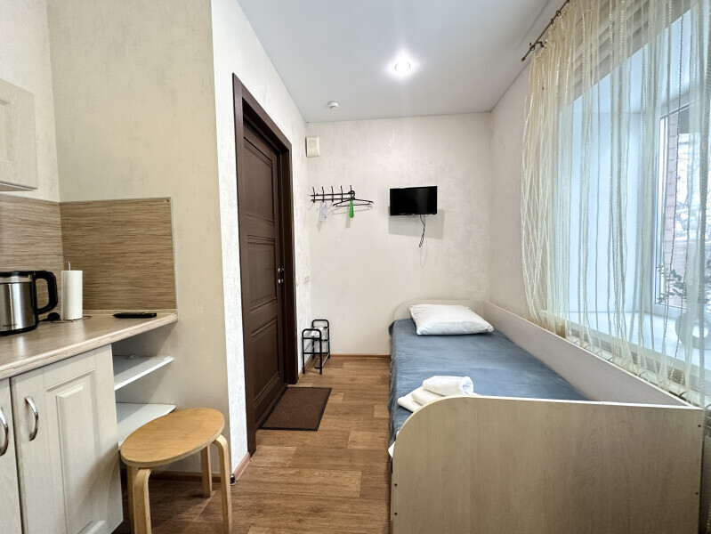 Одноместный номер категории «стандарт», 12м2, оснащен мини-кухней: чайник, вся необходимая посуда. Приятный бонус в виде чая и конфет. Собственная ванная комната с душем. Комплект полотенец.Телевизор и бесплатный wi-fi.