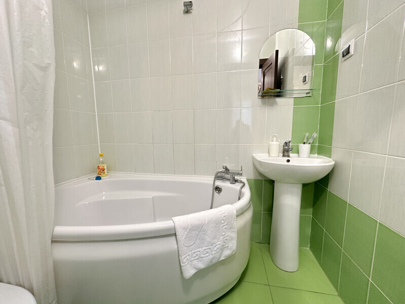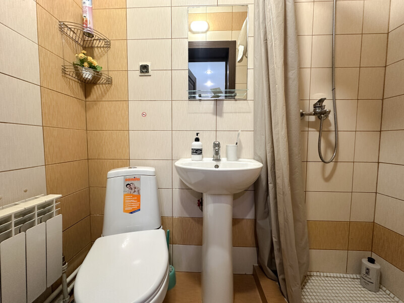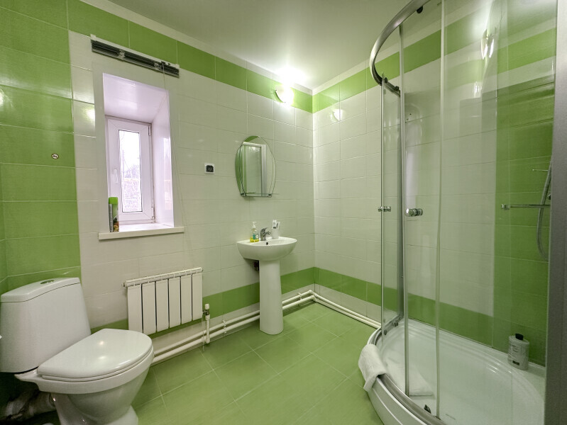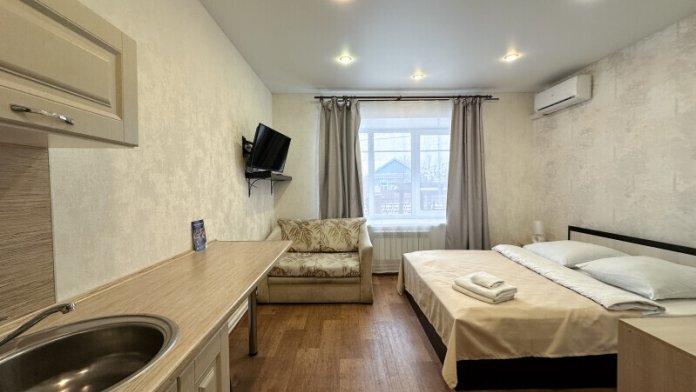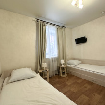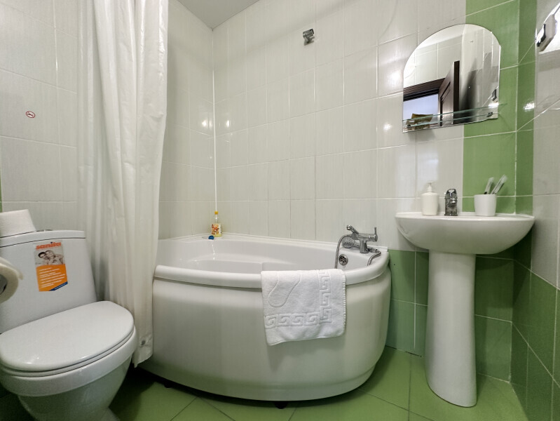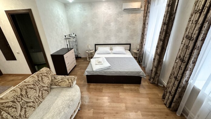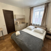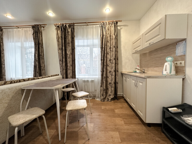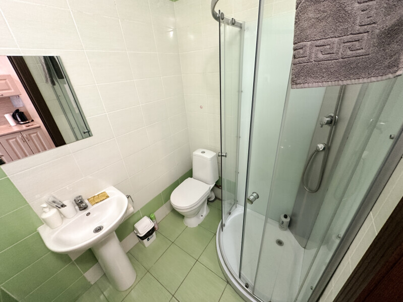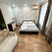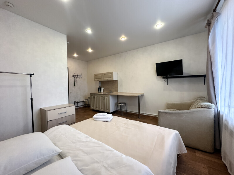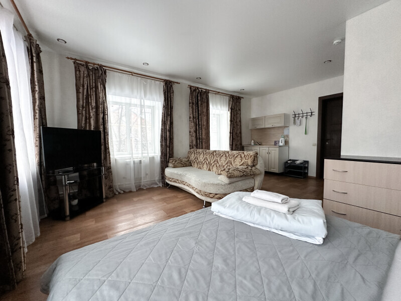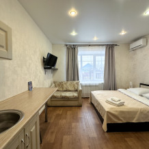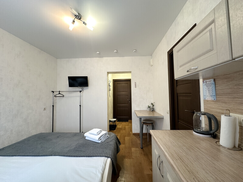 Улучшенный номер, 20м2, оснащен мини-кухней: чайник, вся необходимая посуда. Приятный бонус в виде чая и конфет. Собственная ванная комната с душем. Комплект полотенец, кондиционер, телевизор и бесплатный wi-fi.