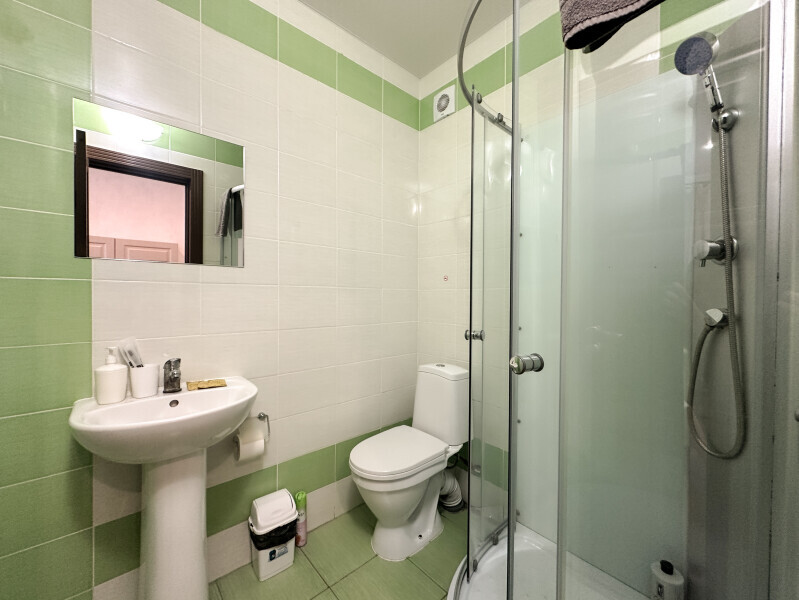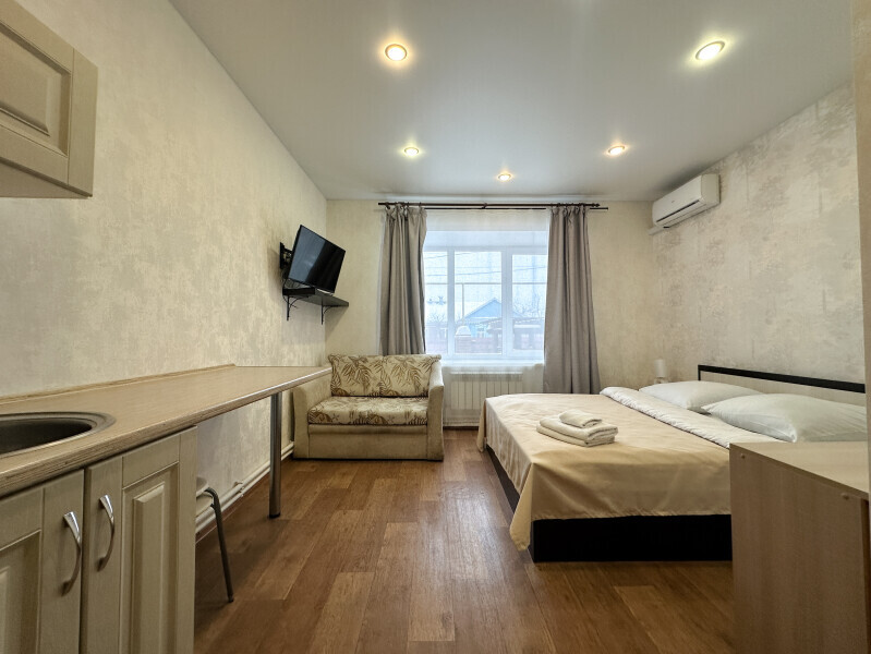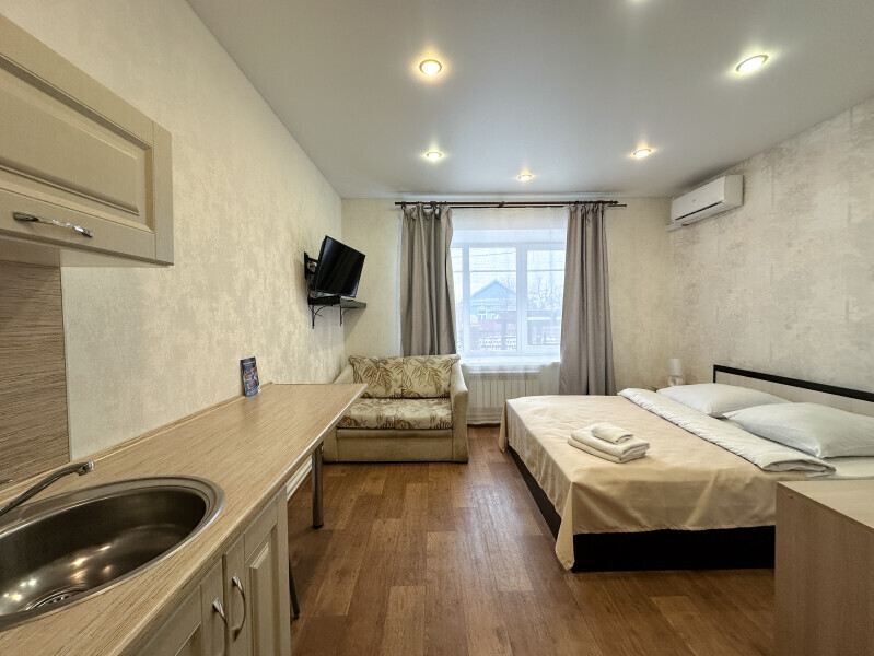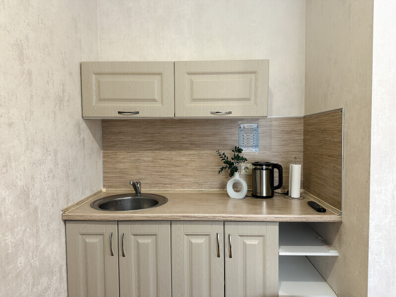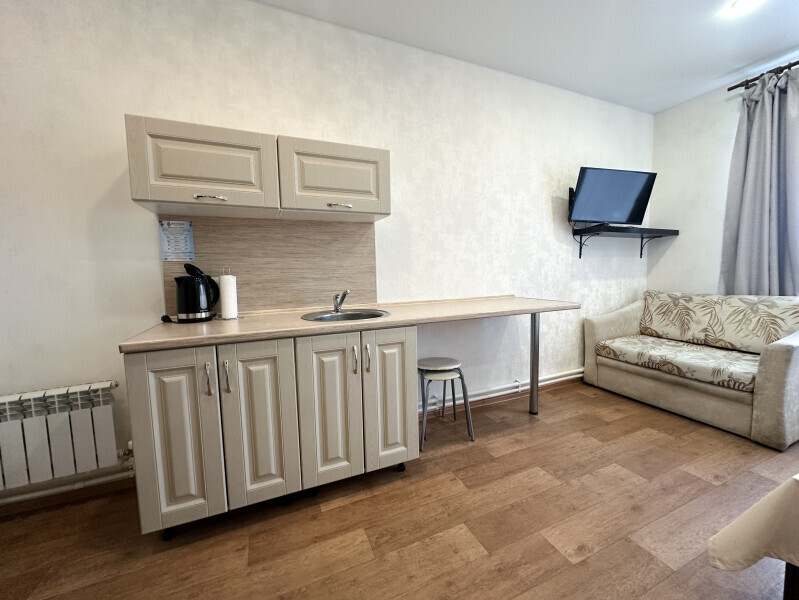 Номер комфорт, 22м2, оснащен мини-кухней: чайник, стол со стульями, вся необходимая посуда. Приятный бонус в виде чая и конфет. Собственная ванная комната с душем. Комплект полотенец. Кондиционер, телевизор и бесплатный wi-fi.