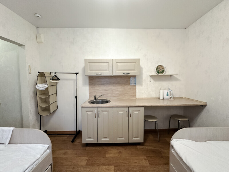 Номер категории «стандарт», 16м2, оснащен мини-кухней: чайник, вся необходимая посуда. Приятный бонус в виде чая и конфет. Собственная ванная комната с душем. Комплект полотенец. Телевизор и бесплатный wi-fi.