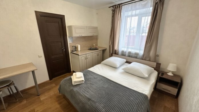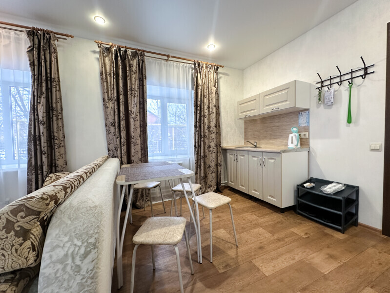 Гостиница представляет собой двухэтажное здание, в котором расположены 10 уютных комфортных номеров-студий.