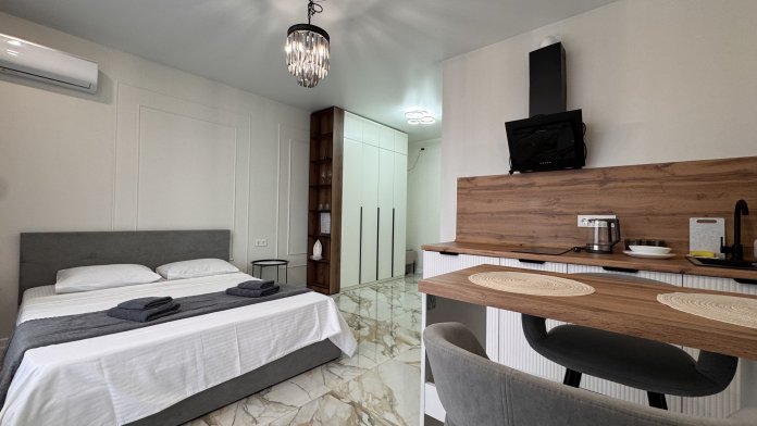 Для Вашего удобства предоставлены: стиральная машинка, двуспальная кровать с ортопедическим матрасом 160/200, кухонная зона, телевизор Smart TV, мини холодильник, плита, чайник, посуда, утюг, гладильная доска, сушилка для белья, фен, безлимитный Wi-Fi, кондиционер.