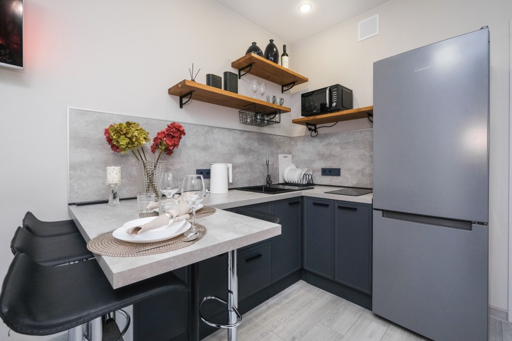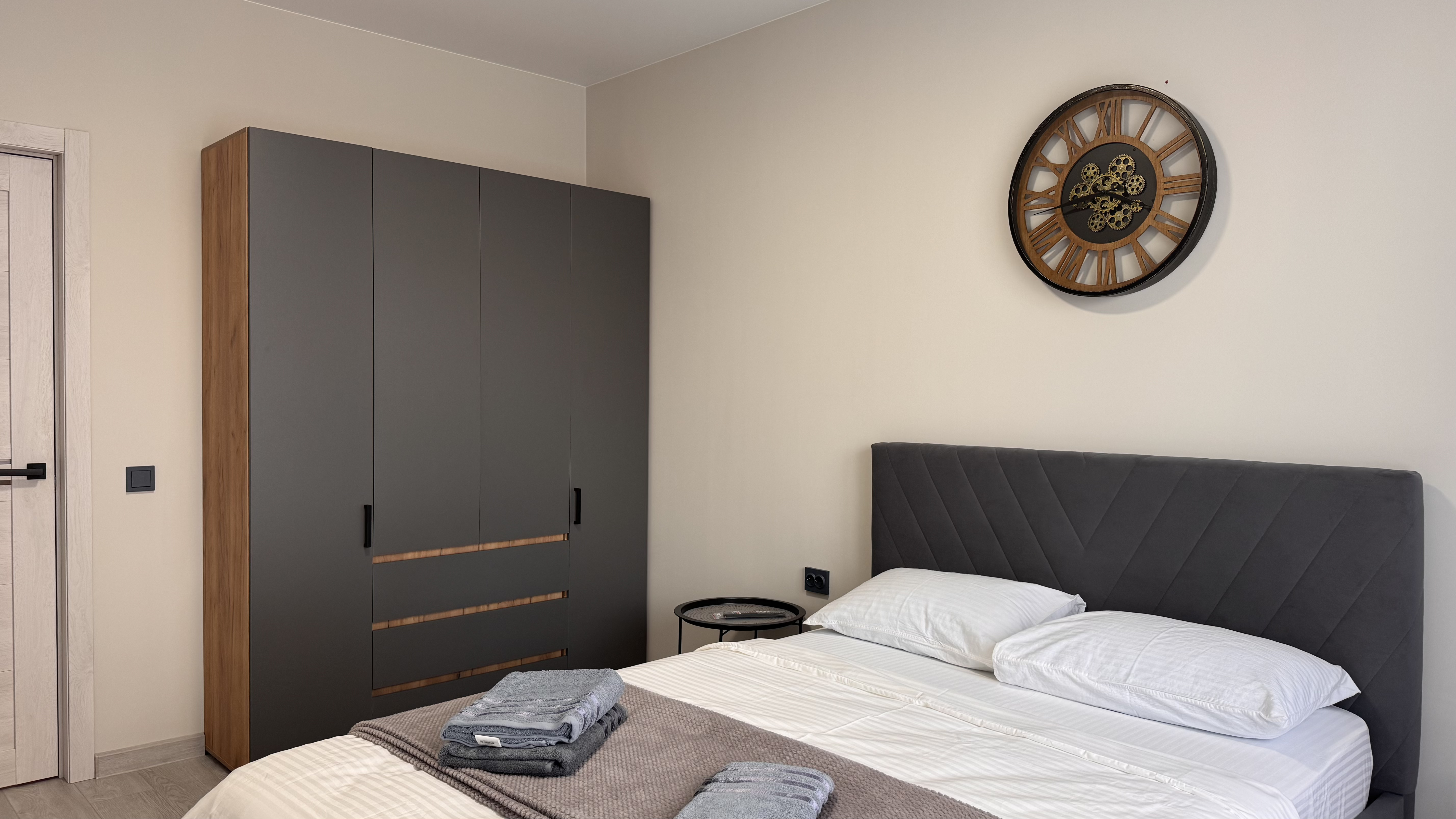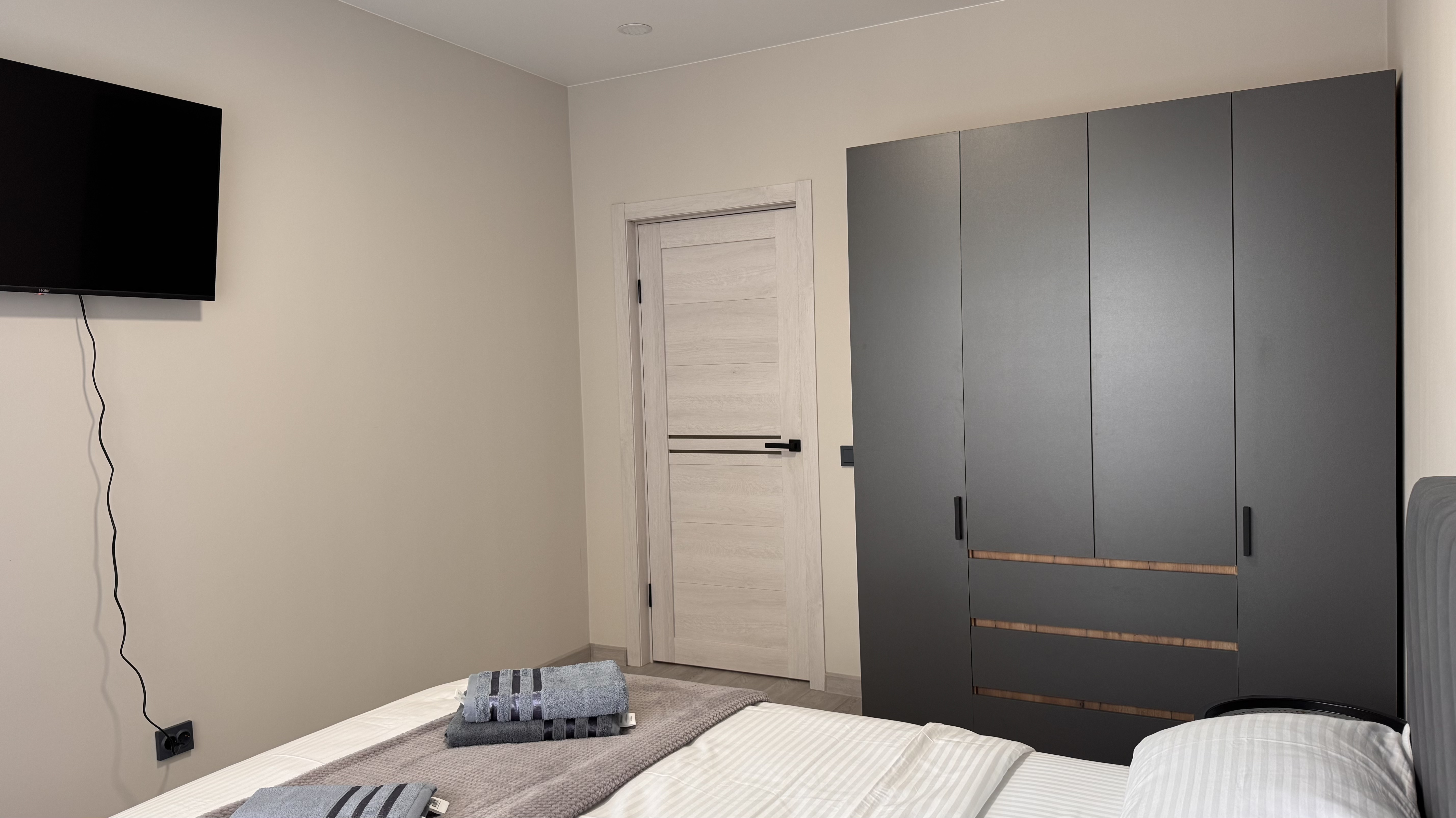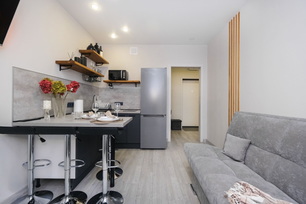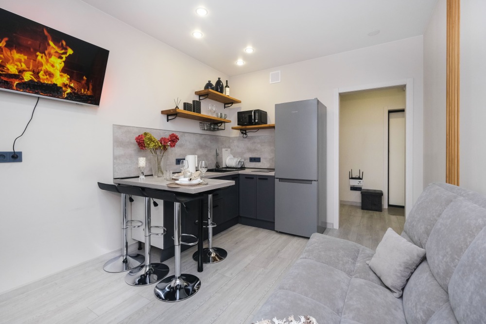 Для Вашего удобства предоставлены: стиральная машинка, двуспальная кровать 200/160, кухонная зона, телевизор Smart TV, холодильник, плита, микроволновая печь, чайник, посуда, утюг, гладильная доска, сушилка для белья, фен, безлимитный Wi-Fi.