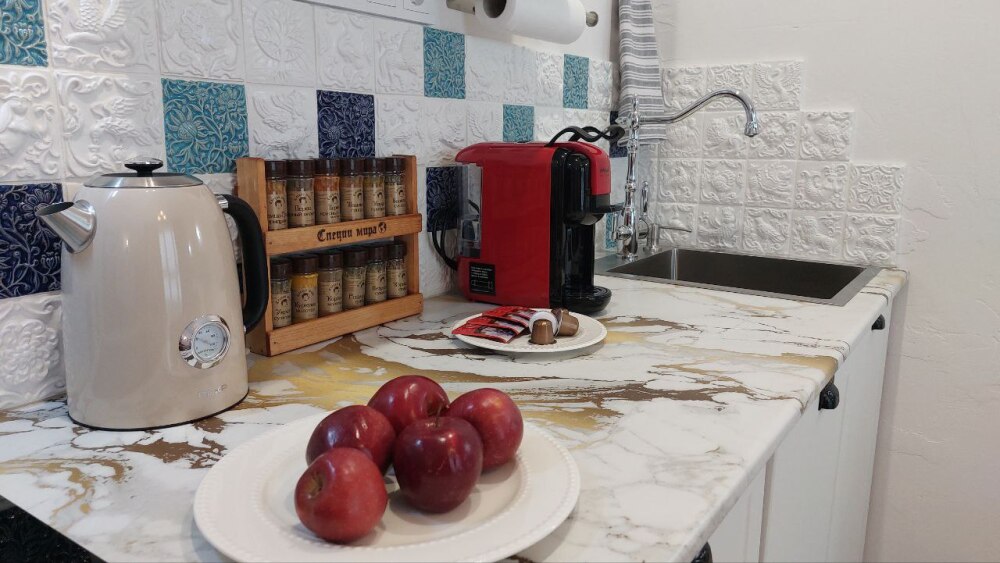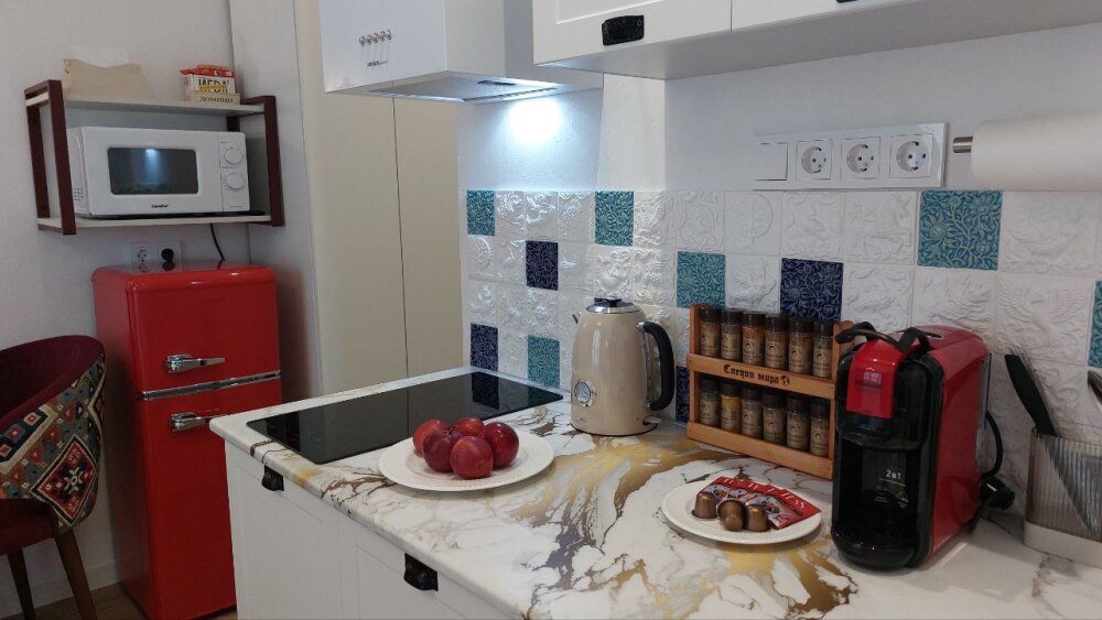 - Холодильник, посудомоечная машина, варочная поверхность, стиральная машина, микроволновка, чайник и капсульная кофемашина.