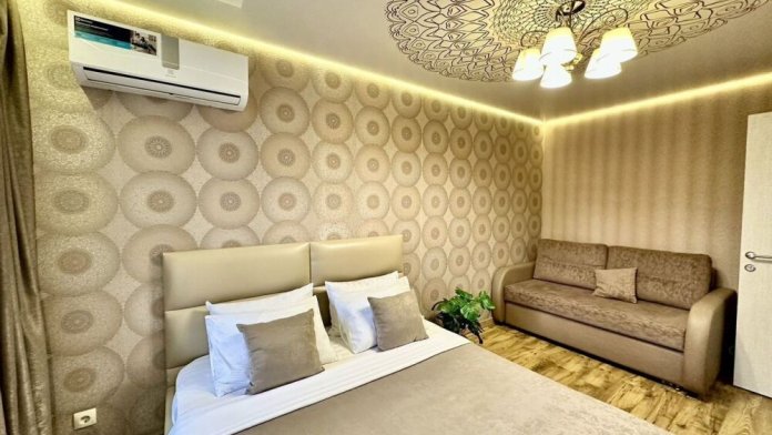 - Для отдыха: двуспальная кровать с ортопедическим матрасом, диван, качественное постельное бельё, сплит-система.
