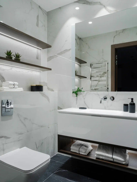 Современная ванная комната, свежие полотенца и аксессуары.