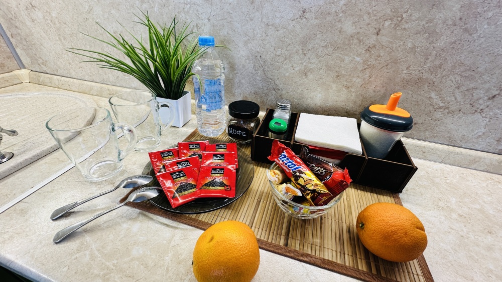 Приветственный комплимент в виде чая, кофе, конфет, а так же предметы первой необходимости (шампунь, гель для душа, зубная паста, туалетная бумага) поднимут вам настроение.