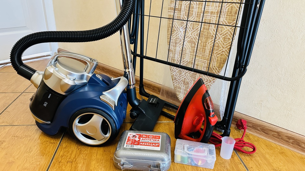 - Бытовая техника (3 телевизора, стиральная машина, холодильник, свч печь, газовая плита, фильтр для воды, утюг, фен) гладильная доска, сушилка.