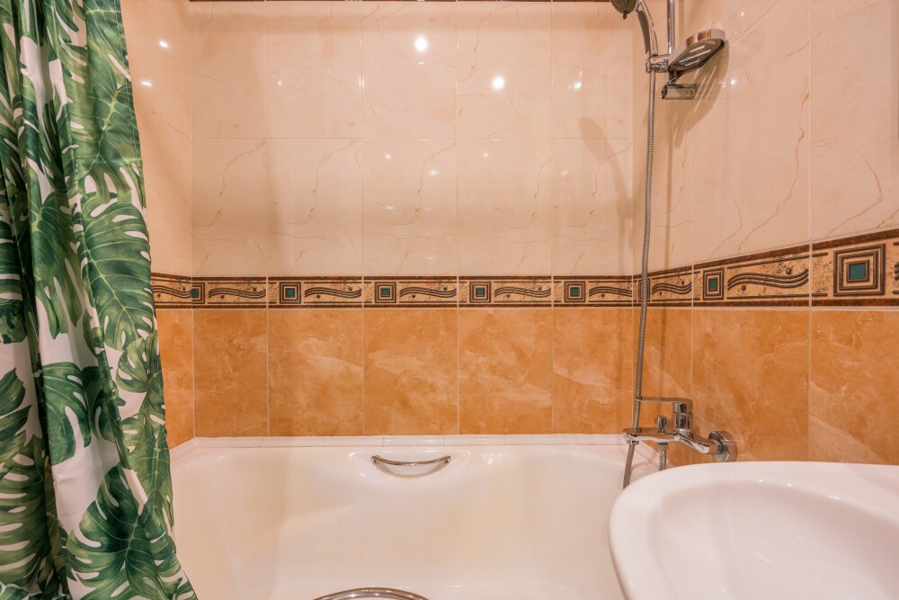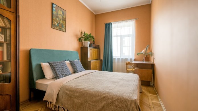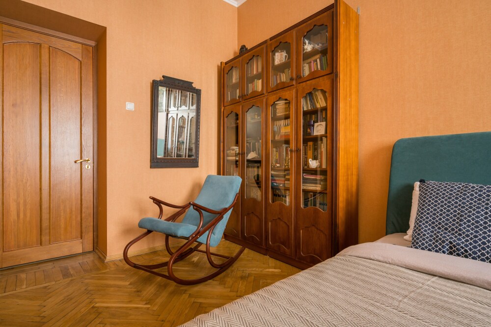 Окна гостиной выходят на улицу, окна двух спален выходят в тихий спокойный двор. Изолированные ванная комната и туалет. В ванной комнате расположена ванна, стиральная машинка, раковина. В туалете установлен накопительный бойлер (на случай отключения горячей воды). 1 спальня: Двуспальная кровать и матрас Аскона (160-200), большой библиотечный шкаф, письменный стол со стулом. 2 спальня: Двуспальная кровать King size (180х200) и матрас Аскона. Кровать можно разделить на две кровати по 90х200. В комнате расположен большой шкаф для одежды и вместительный комод. 3 гостиная: Большой угловой раскладной кожаный диван. В комнате ТВ, большая библиотека, стол. Кухня: Выполнена из массива дуба. В кухонной зоне расположены большой обеденный стол, газовая панель и газовая духовка, большой двухкамерный холодильник, посудомоечная машина, вся необходимая посуда.