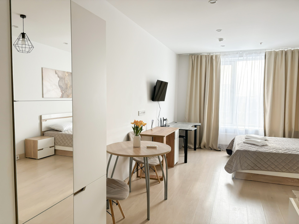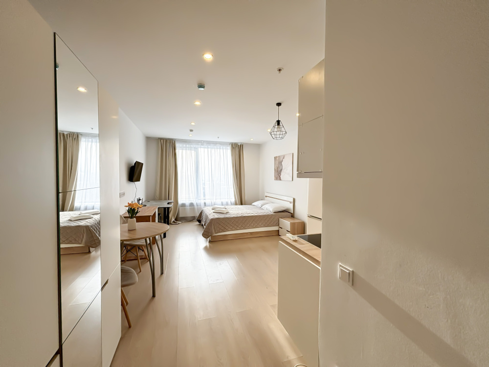 Светлые апартаменты студийной планировки предлагаются в апарт-отеле «YE'S Ботанический сад» для проживания. Качественная отделка в сочетании с удобной мебелью образуют комфортабельное пространство для жизни.