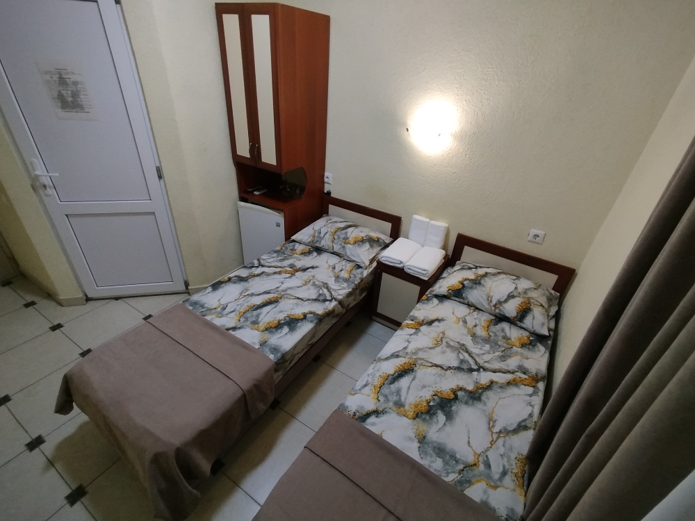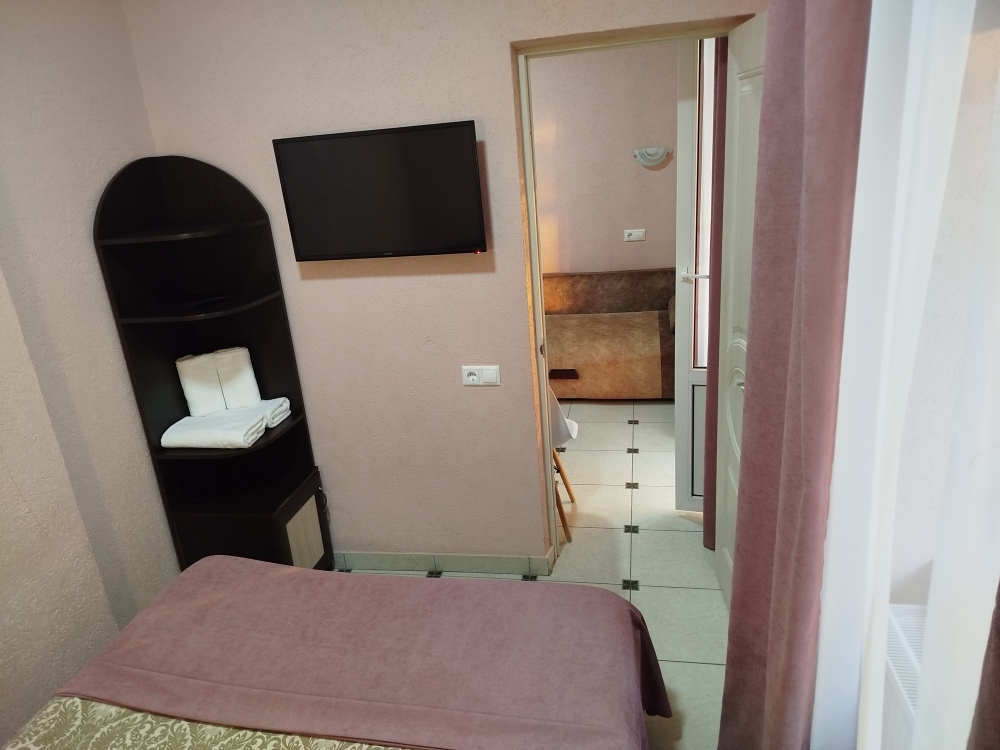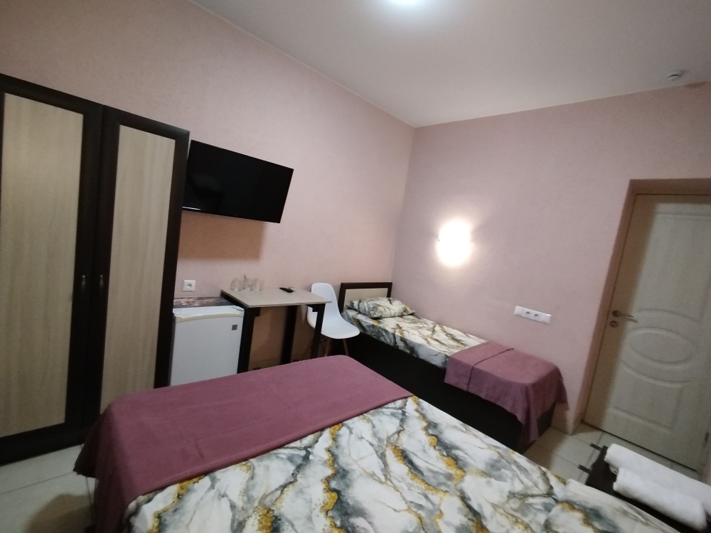 Таких номеров всего 3, на 2, 3, 4 этаже. Электрочайник, микроволновая печь, фен, утюг, гладильная доска находятся на каждом этаже, в коридоре, для общего пользования. Есть летняя кухня со всем инвентарем. конечная уборка входит в стоимость. При длительном проживании уборка и смена белья за отдельную стоимость.