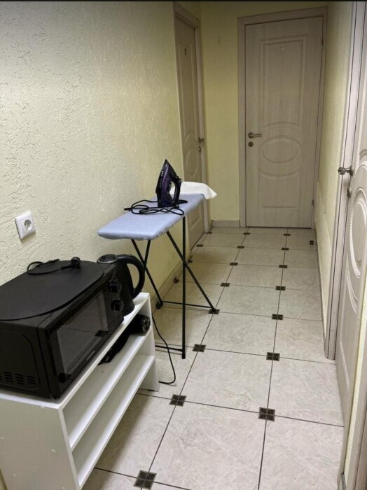 Таких номеров всего 3, на 2, 3, 4 этажах. Электрочайник, микроволновая печь, фен, утюг, гладильная доска находятся на каждом этаже, в коридоре, для общего пользования.