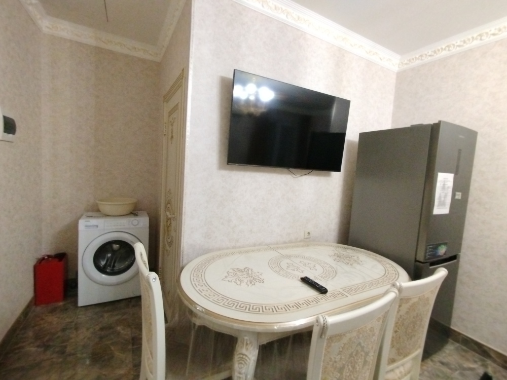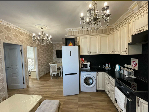 Апартаменты оснащены кондиционером и телевизорами, есть полноценная кухня и вся необходимая посуда для готовки, холодильник, стиральная машина. Также просторная ванная комната. В каждой комнате чистое постельное бельё и полотенца, которые по запросу поменяют.