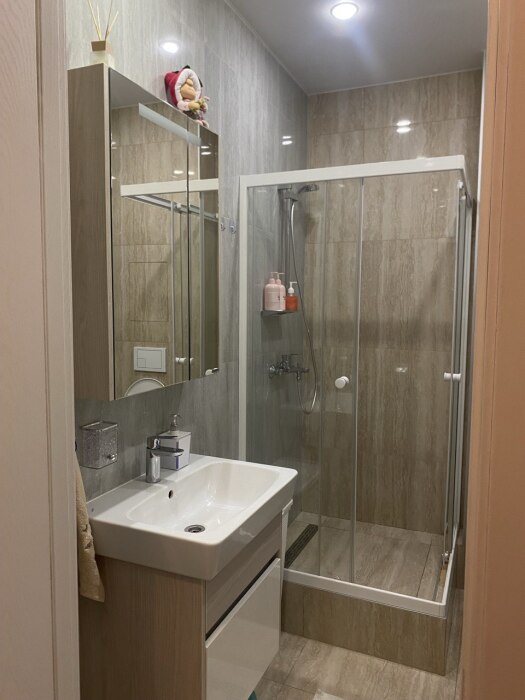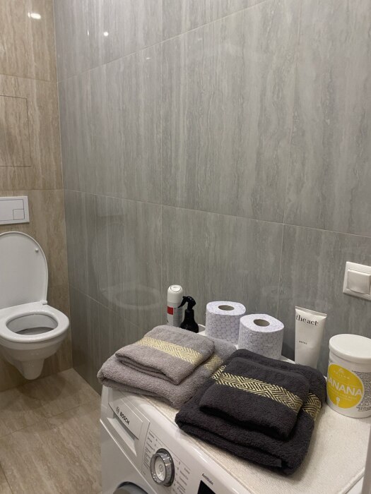 Душ, стиральная машина, полотенца, средства гигиены, уходовые средства, утюжок для выпрямления волос.