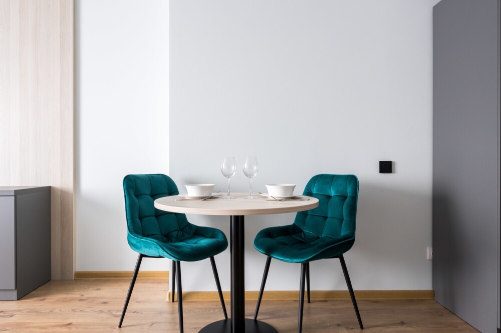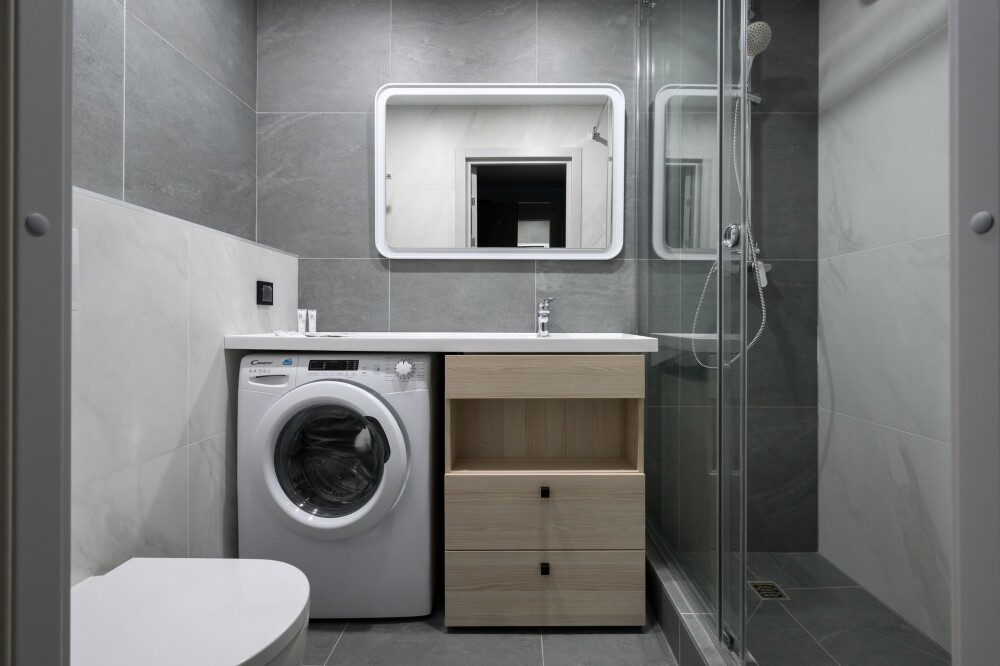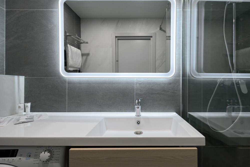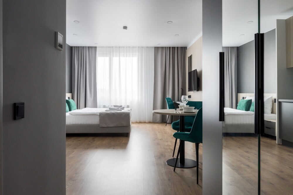Вся необходимая мебель и техника: Апартаменты оснащены всем необходимым для комфортного проживания: Двуспальная кровать, прикроватные тумбы с доп. освещением, в зоне гостиной ЖК-тв с функцией Smаrt ТV, удобное пространство для работы за ноутбуком; полностью оборудованная мини-кухня с посудомоечной машиной, мини-холодильником, свч, чайником и всей необходимой кухонной утварью; большой гардероб в прихожей; совмещенный санузел с душевой, стиральной машинкой. Wi-Fi на всей территории.