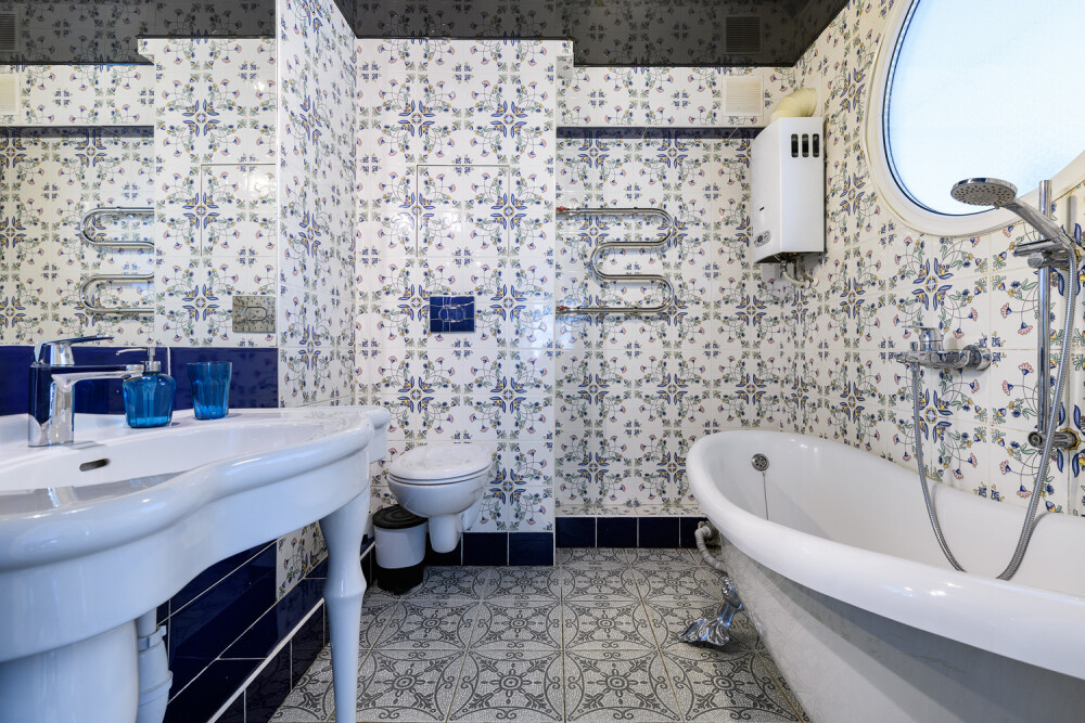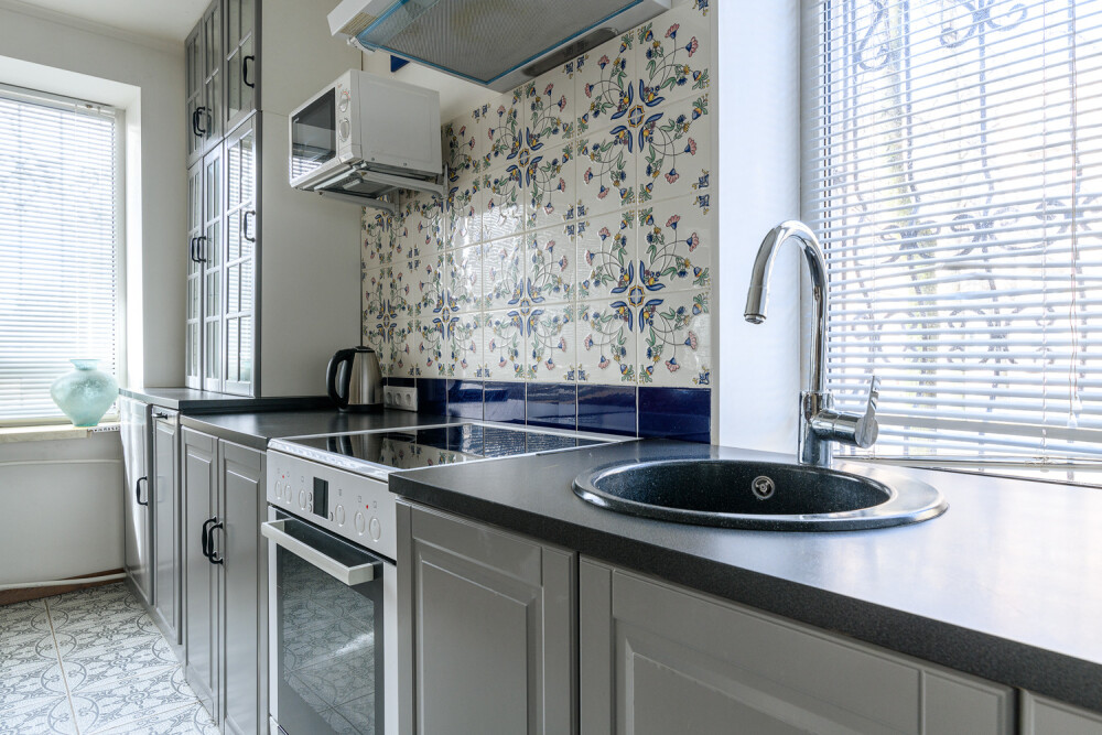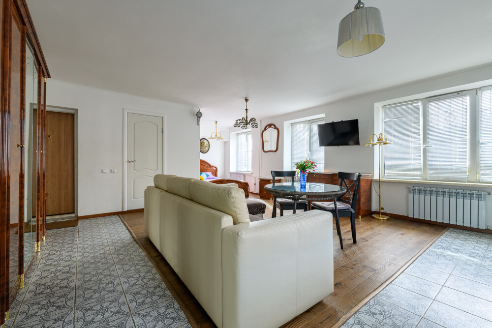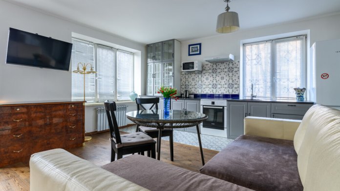 Квартира визуально разделена на три зоны: спальню, гостиную и кухонную зону. Двуспальная кровать с удобным матрасом располагается в зоне спальни, в небольшом углублении, что абсолютно не мешает передвигаться по квартире. В зоне гостинной располагается функциональный угловой диван из эко-кожи: в дневное время он прекрасно подойдет для отдыха и просмотра ТВ, а в ночное время с легкостью превращается в спальное место для двоих человек. В кухонной зоне вы всегда сможете приготовить себе завтрак, обед или ужин, приятно посидеть за чашечкой кофе на диванчике за элегантным столом и воспользоваться посудомоечной и стиральной машинами. Элегантная и просторная ванная комната оформлена в стиле романтизм, что придает ей мечтательное и возвышенное настроение. В Ванной установлен электрический бойлер, что означает, что в квартире всегда есть холодная и горячая вода.