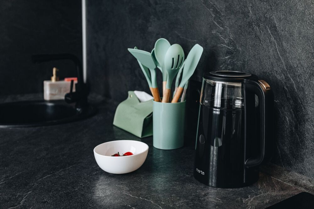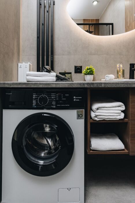 - Холодильник, варочная поверхность, стиральная машина, микроволновка, чайник и гейзерная кофеварка.