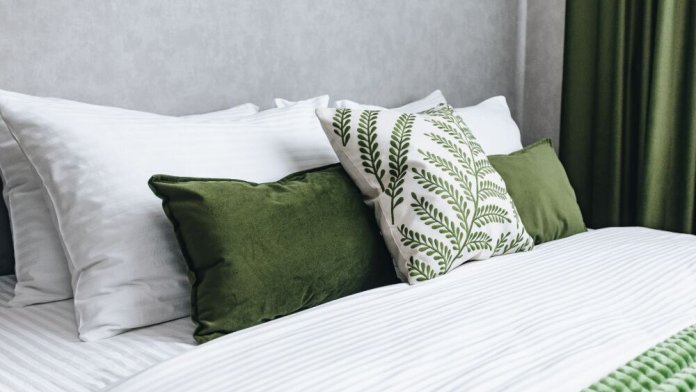 - Большая двуспальная кровать с ортопедическим матрасом и белоснежным бельем из страйп-сатина.
