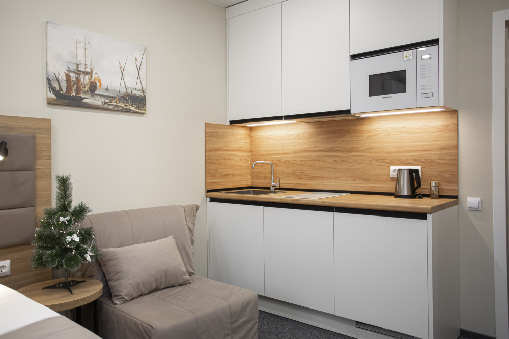 Размещение до 3 человек: двуспальная кровать + кресло-кровать.