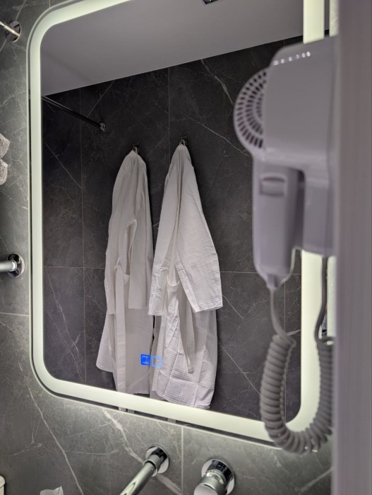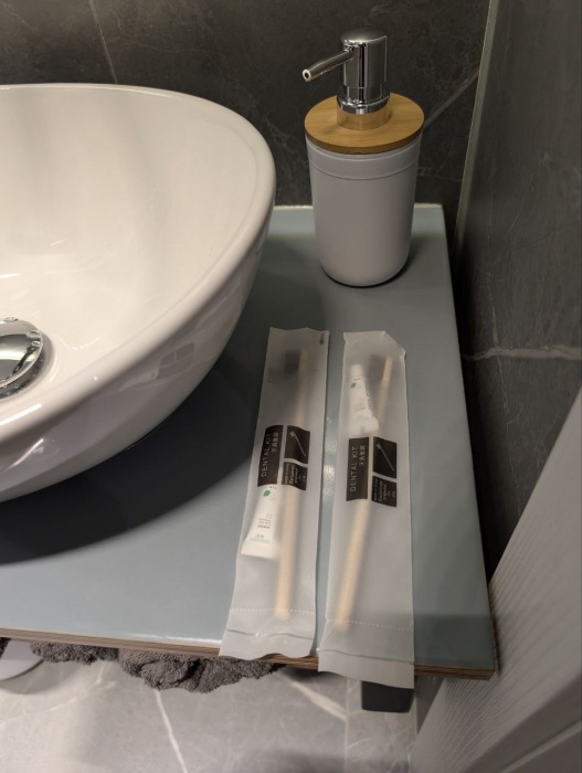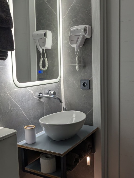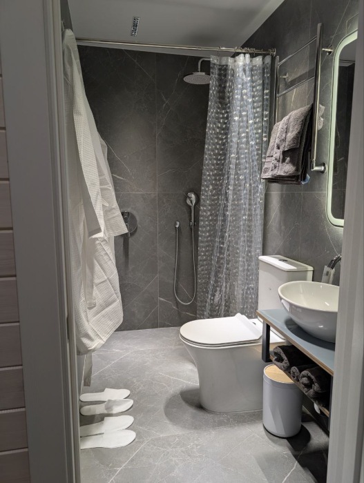 Небольшая удобная кухня, посуда, столовые приборы, холодильник, электрочайник с температурными режимами, микроволновая печь, фильтр кувшин, барная стойка, барные стулья, быстрый Wi-Fi до 250 мг, что создаёт комфортные условия для IT работы, телевизор, современный санузел с тропическим душем, теплые полы, фен, полотенцесушитель, предоставлены халаты, одноразовые тапочки, шампунь, гель для душа, зубная щётка с зубной пастой (индивидуальная упаковка) комплект полотенец.
