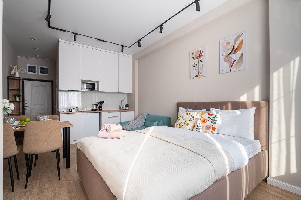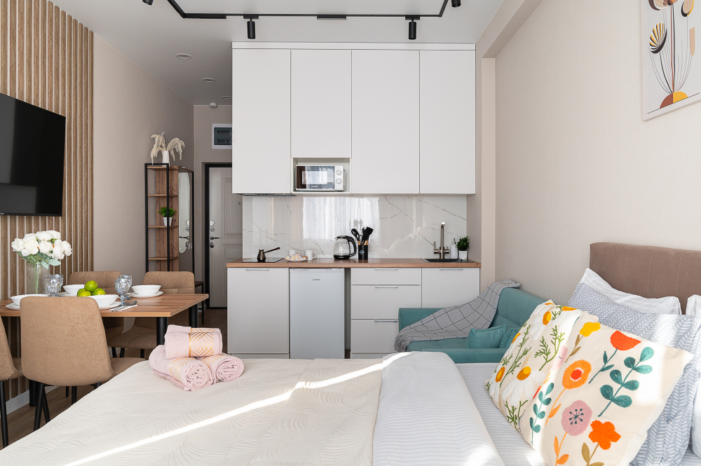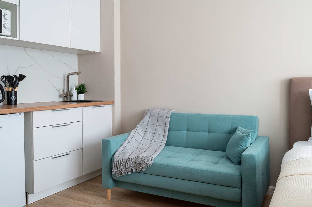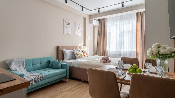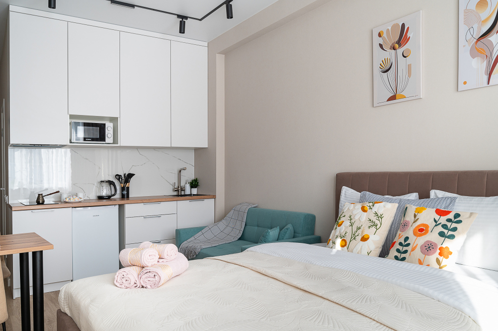 - Размещение: до 3 человек (двуспальный диван, раскладной диван).
